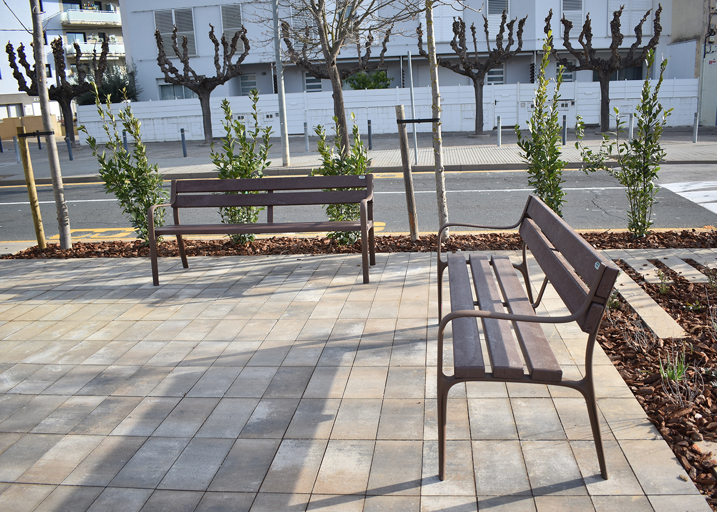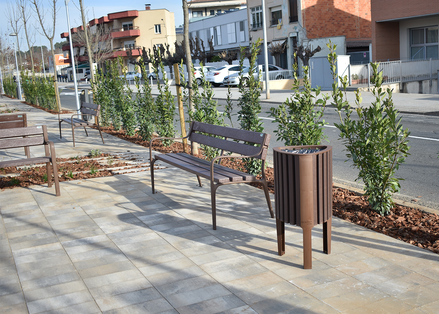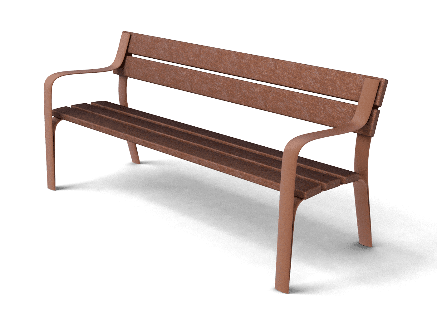 Seient i respatller en tauló Rebnew, bancada amb reposabraços fabricada en polímer injectat a alta pressió, amb acabat Marson. No requereix manteniment, no s'astella ni s'esquerda, tampoc es podreix ni es resseca. Resistent a la humitat. Alta resistència a les inclemències. Resistent a tota mena d'agents químics fins al punt de poder netejar pintades i grafitis.