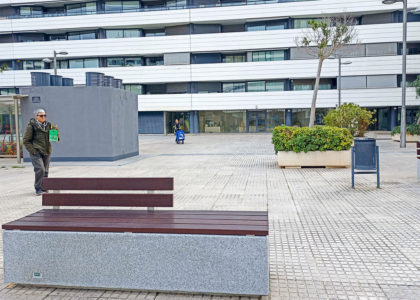 Banc de disseny ELA PLUS 3000, mides totals (llarg x alt x profund) 3000x870x800 mm, fabricat amb seient de formigó armat hidròfug emmotllat, color blanc granític polit, estructura d'acer inoxidable mat i llistons de fusta tropical natural (tractats amb recub fungicida, insecticida i hidròfug). Recolzat sobre superfície preparada, pel seu propi pes.