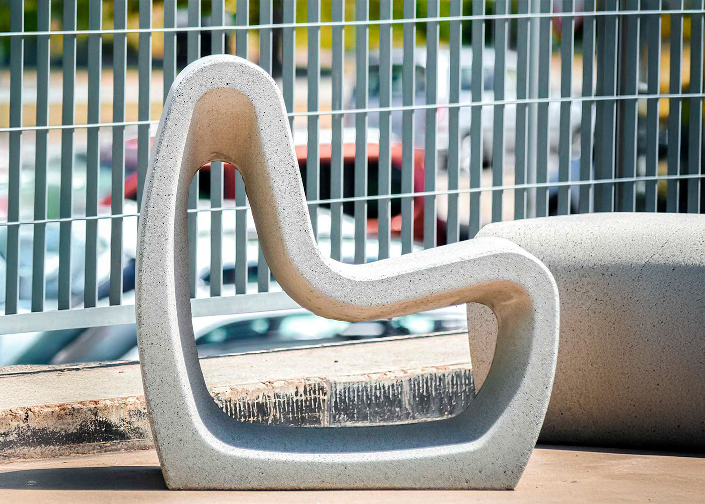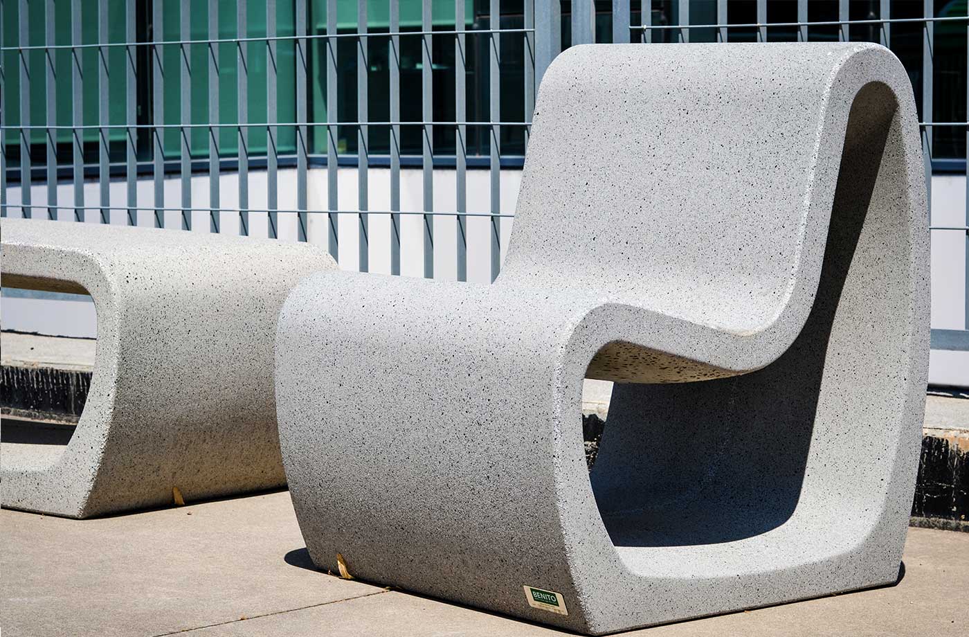 Cadira de disseny PETRUS amb respatller, mides totals (llarg x alt x profund) 600x820x800 mm, fabricat amb prefabricat de formigó color gris granític d'aspecte rugós. Es pot col·locar en forma d'elements aïllats o en grups. Recolzat sobre superfície preparada, pel seu propi pes.