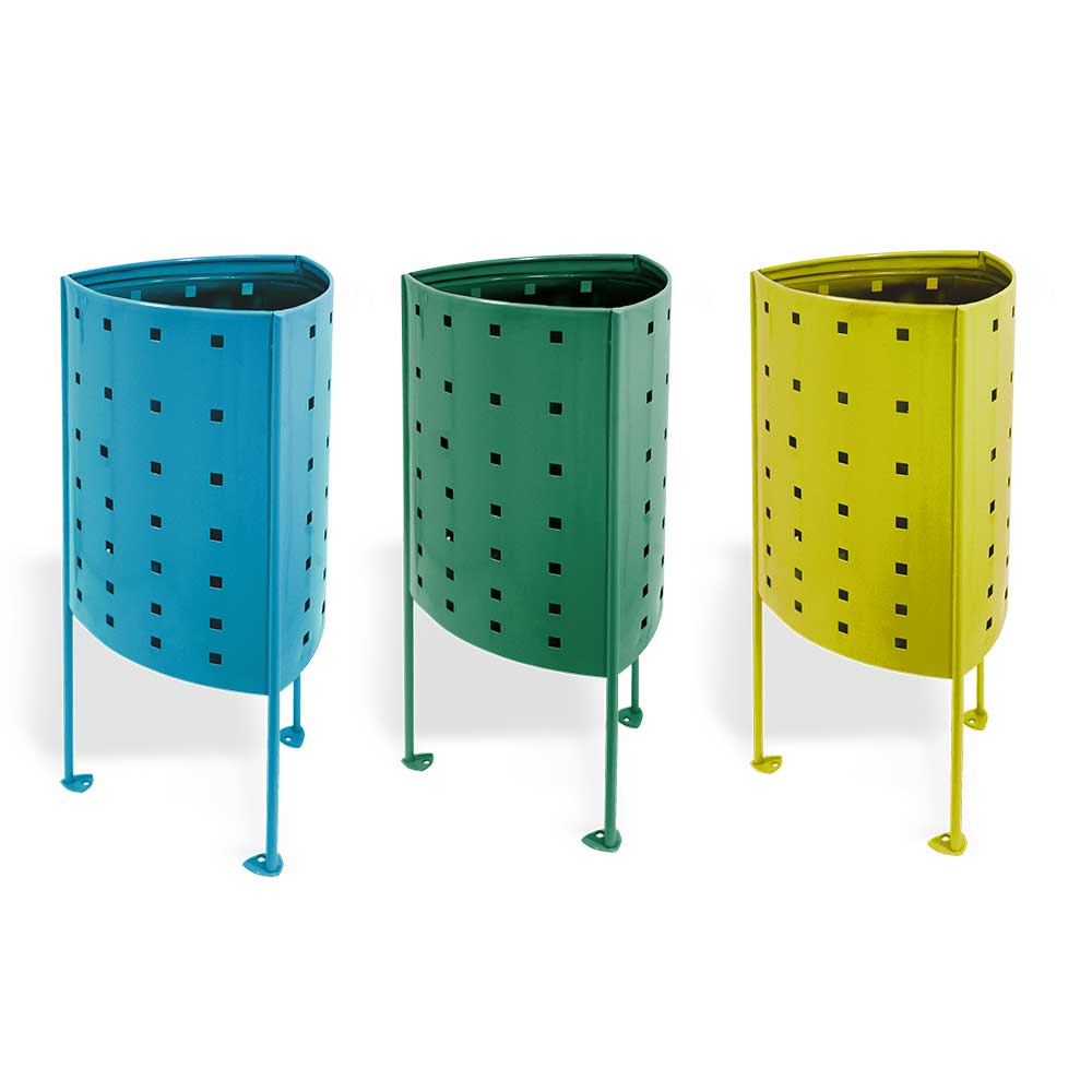Paperera de disseny ARGO, mides totals (ample x profund x alt) 385x385x825 mm, 50 litres, antivandàlica, fabricada amb cubeta d'acer Galvanitzada gris (tractat amb el procés Ferrus el protector de triple capa per al ferro, que garanteix una òptima resistència a la corro triangular amb forats per a la seva fixació al terra. Preparada per a ancoratge amb 3 perns d'expansió M8 segons superfície i projecte.