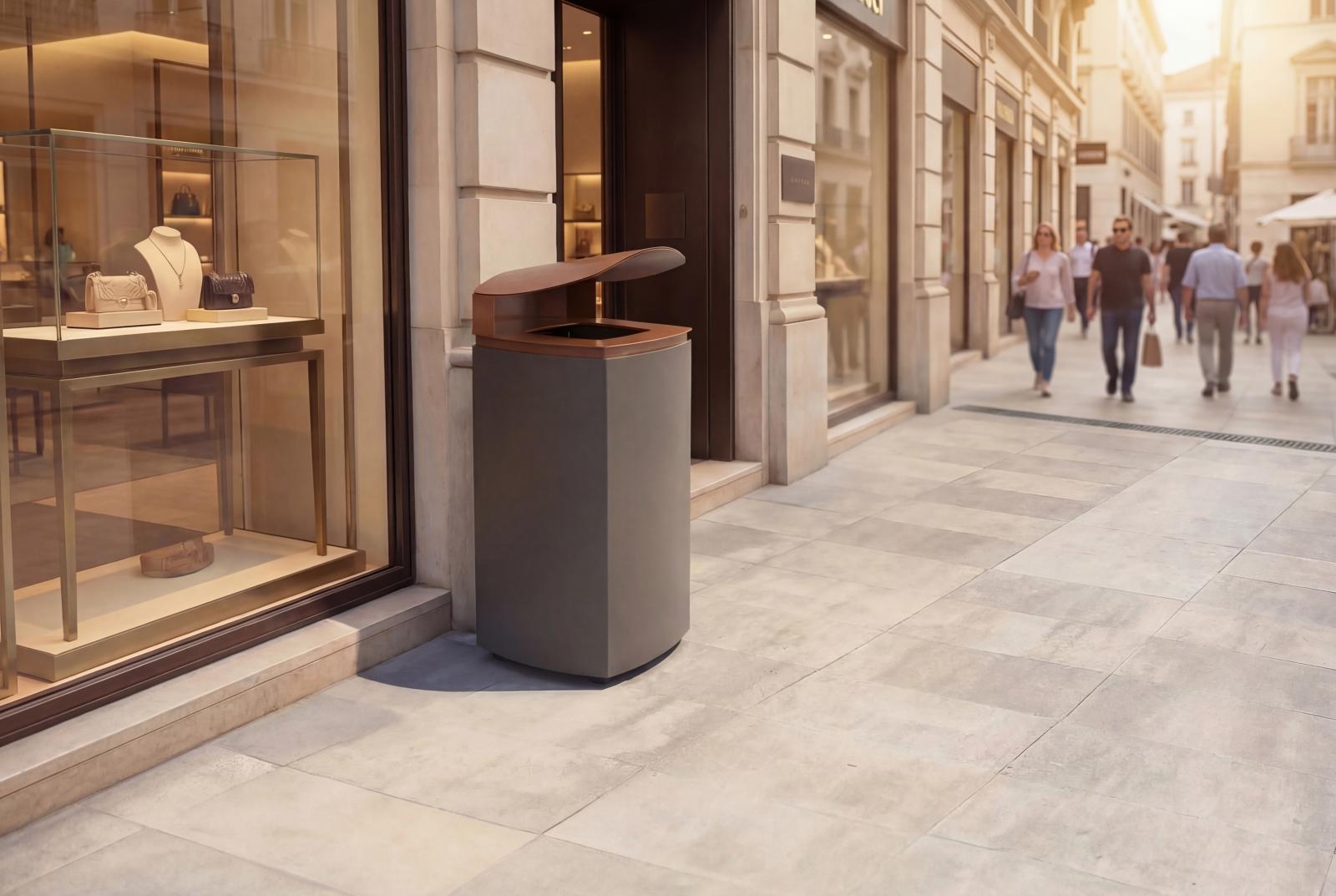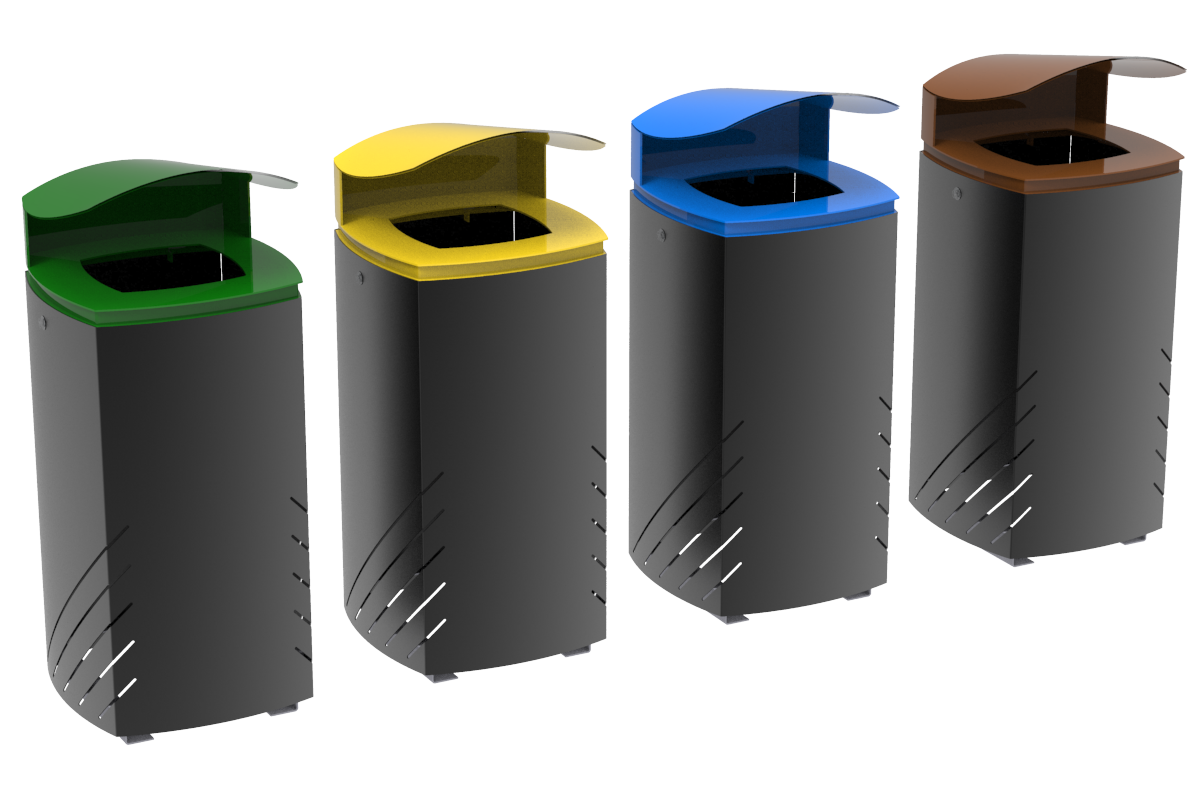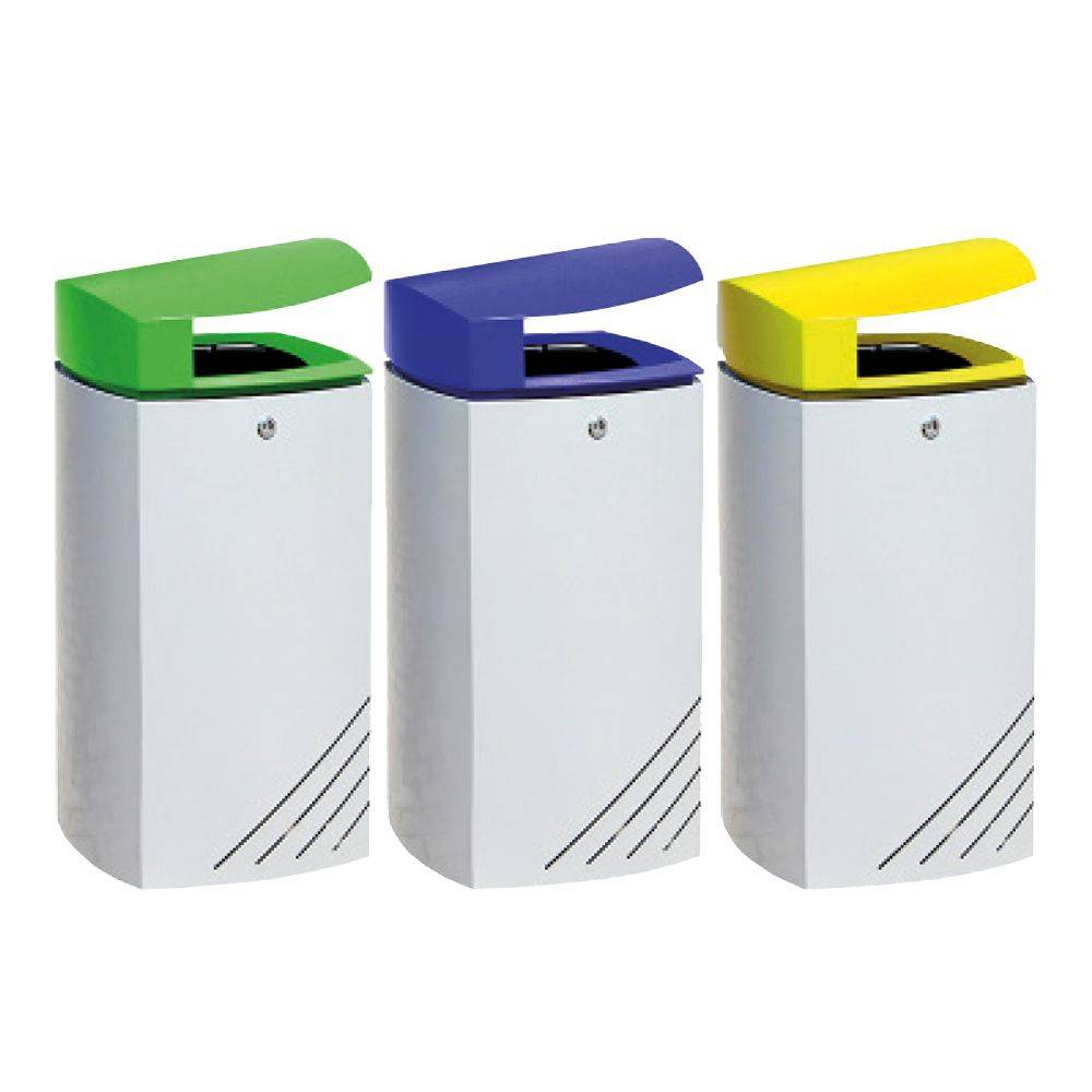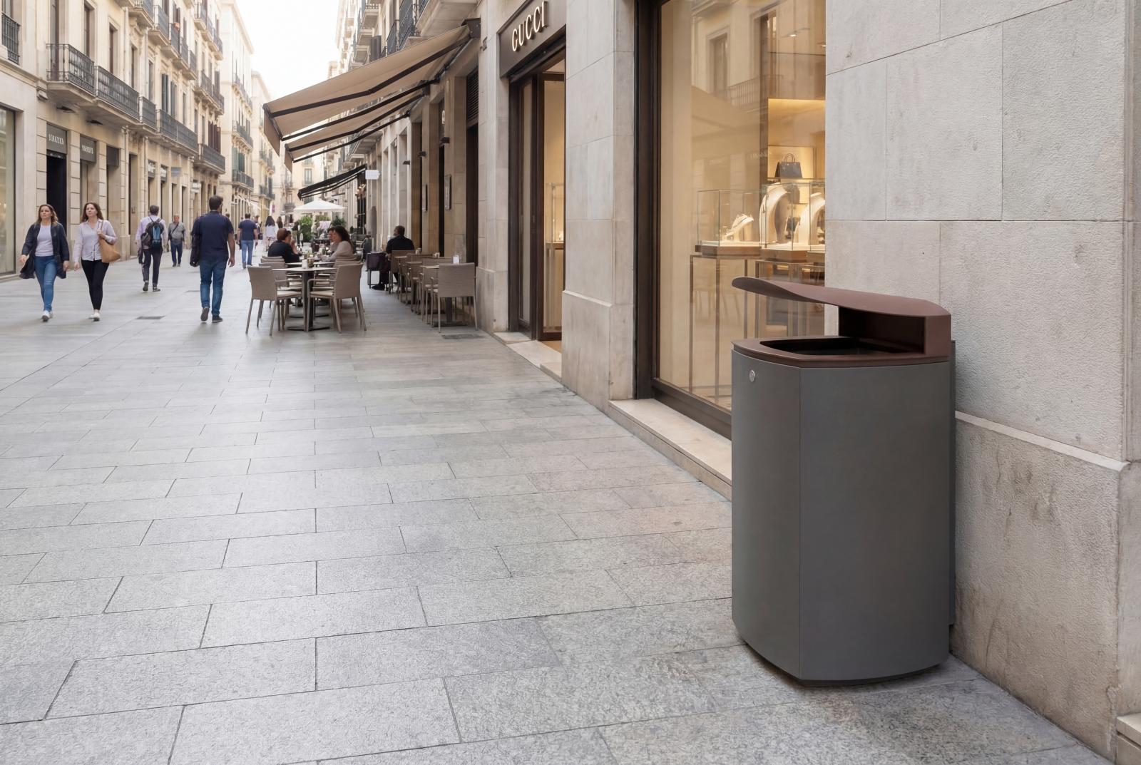 Paperera de disseny MIELEK M, mesures totals (ample x profund x alt) 410x410x920 mm, 80 litres, fabricada en acer (tractat amb el procés Ferrus el protector de triple capa per al ferro, que garanteix una òptima resistència a la corrosió), cubeta interior Galvanitzada , tancament. Preparada per a ancoratge amb 4 perns d'expansió Ø10 segons superfície i projecte.