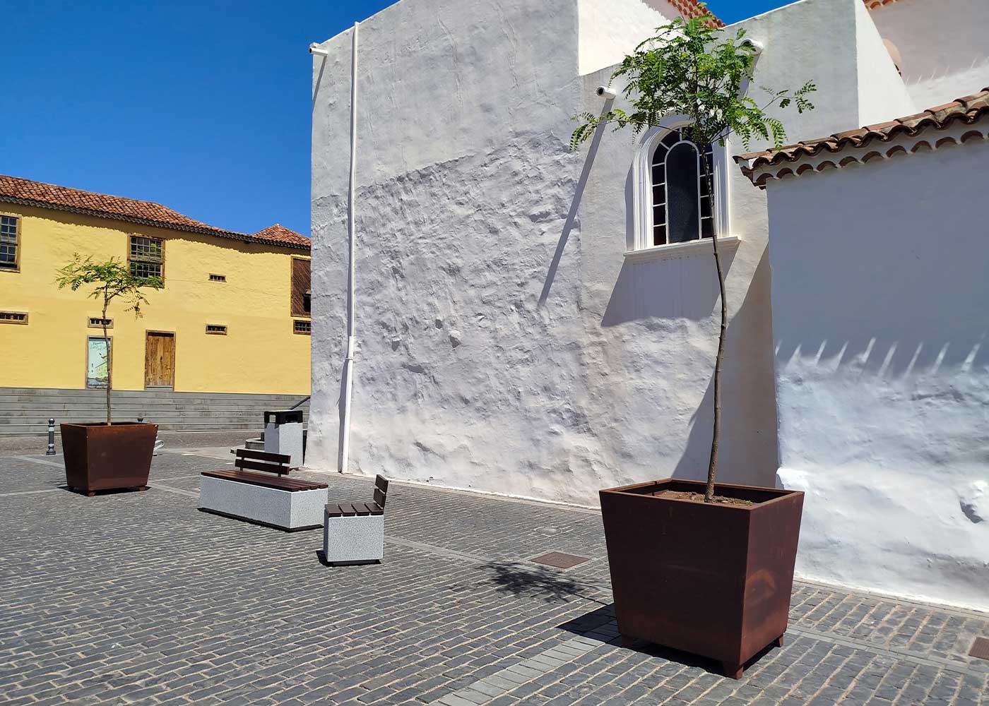 Renovació de la plaça de l’església de Los Silos amb bancs i cadires Kube Plus, jardineres NER i pilones Trajana, combinant disseny resistent i integració en un entorn històric.