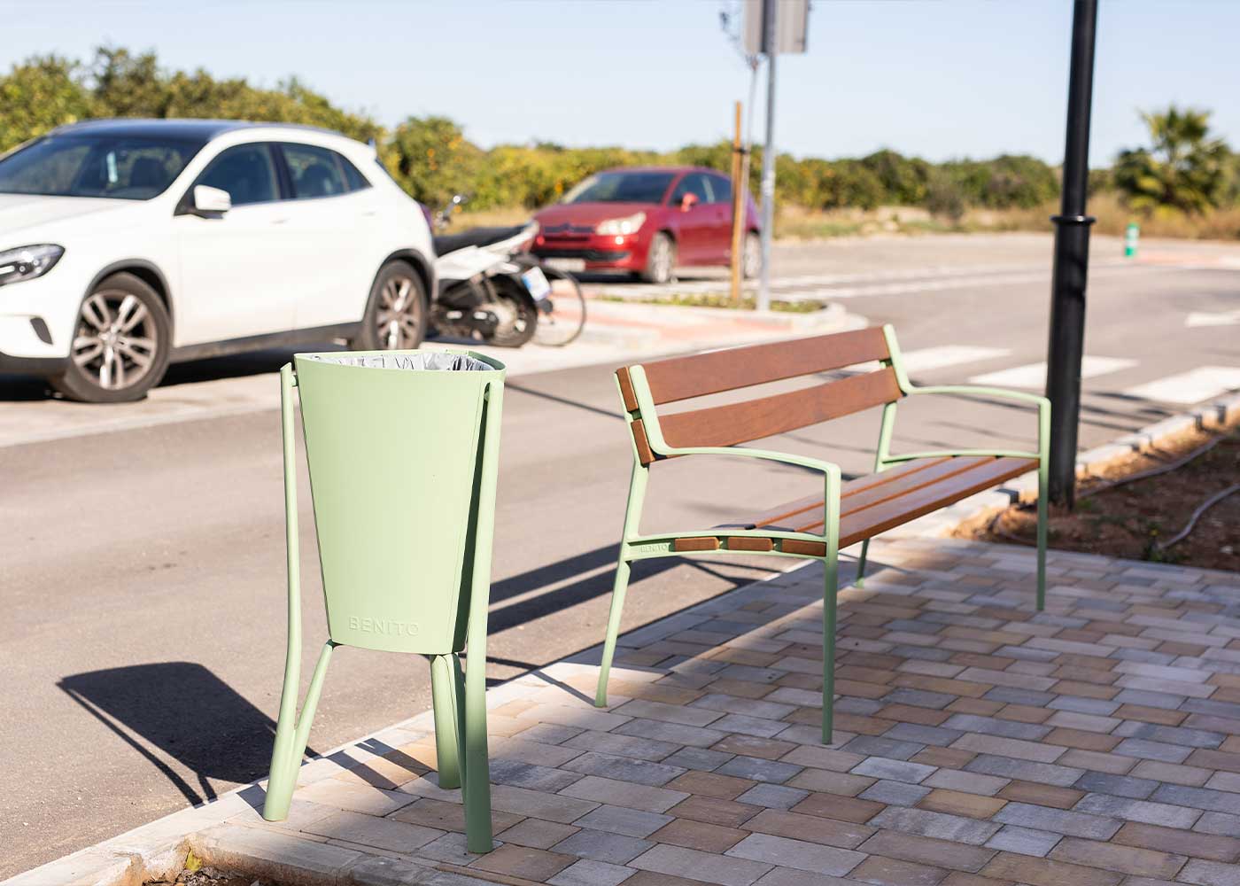 A la Gran Via de Guadassuar s’han incorporat bancs i cadires Minsk en verd oliva, juntament amb papereres a joc, creant un passeig de caràcter natural amb refugis climàtics.