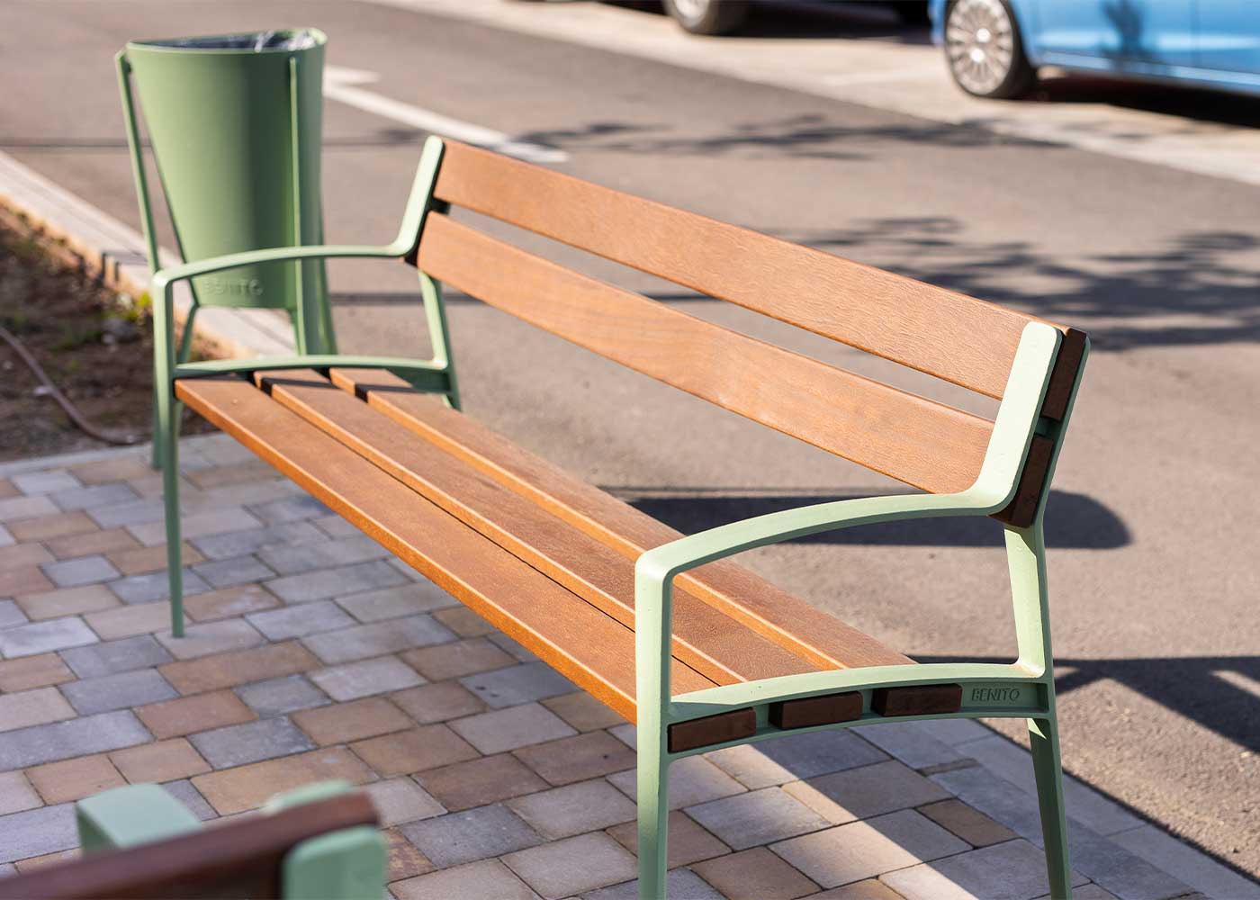 La intervenció incorpora bancs i cadires Minsk en color verd oliva, amb les papereres Minsk del mateix to, generant una imatge unificada i coherent amb l’entorn. L’elecció cromàtica reforça la integració paisatgística i aporta una identitat visual serena i contemporània.