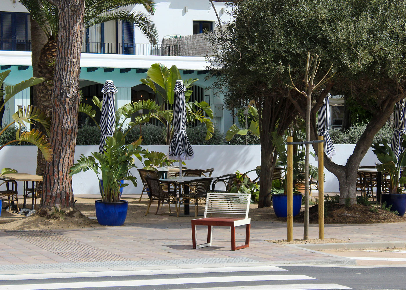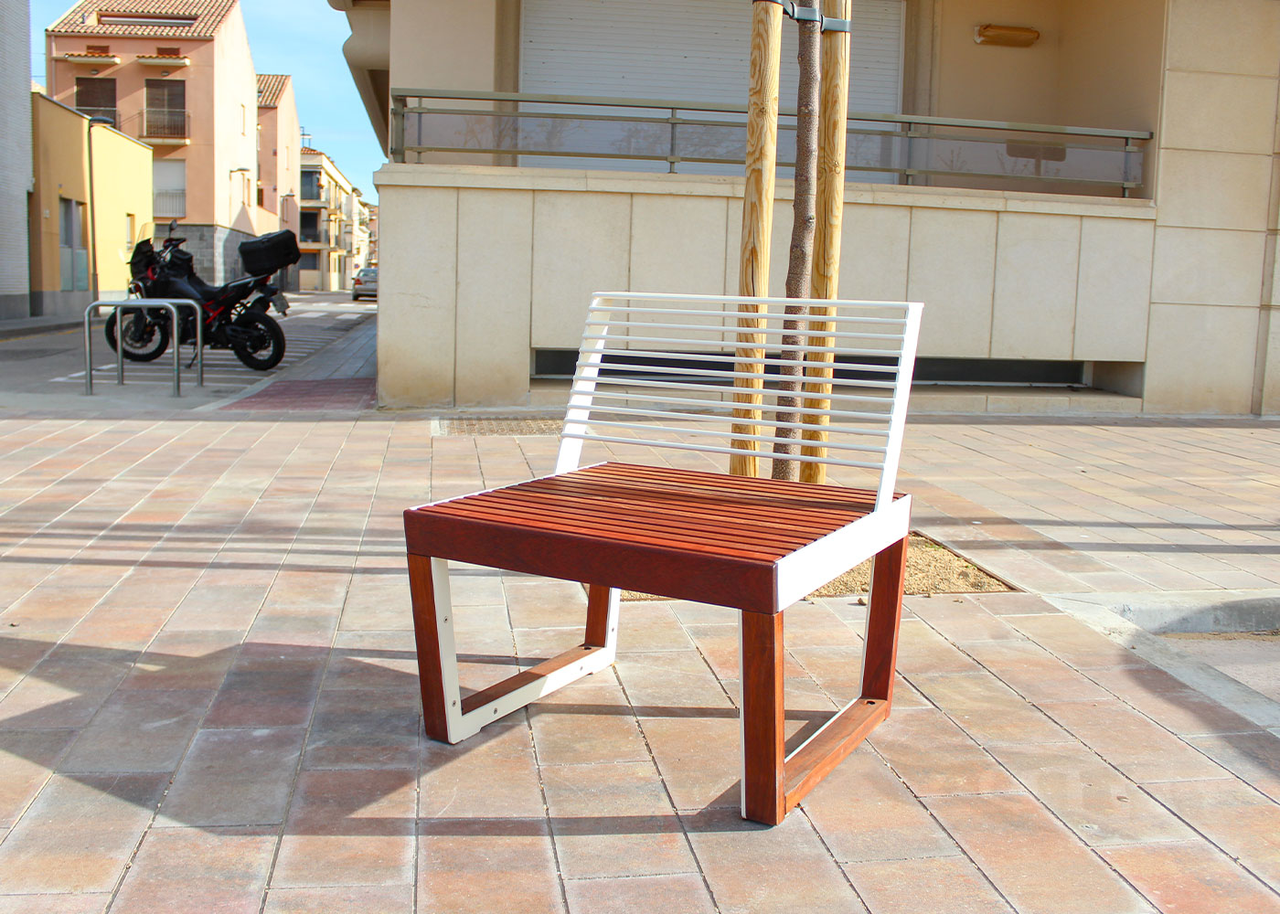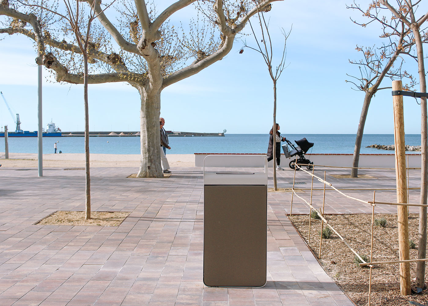 La intervenció incorpora bancs ARKO, pertanyents a la gamma Benito Design+, juntament amb papereres FLO de la mateixa col·lecció, aportant una imatge contemporània i coherent al llarg del passeig.