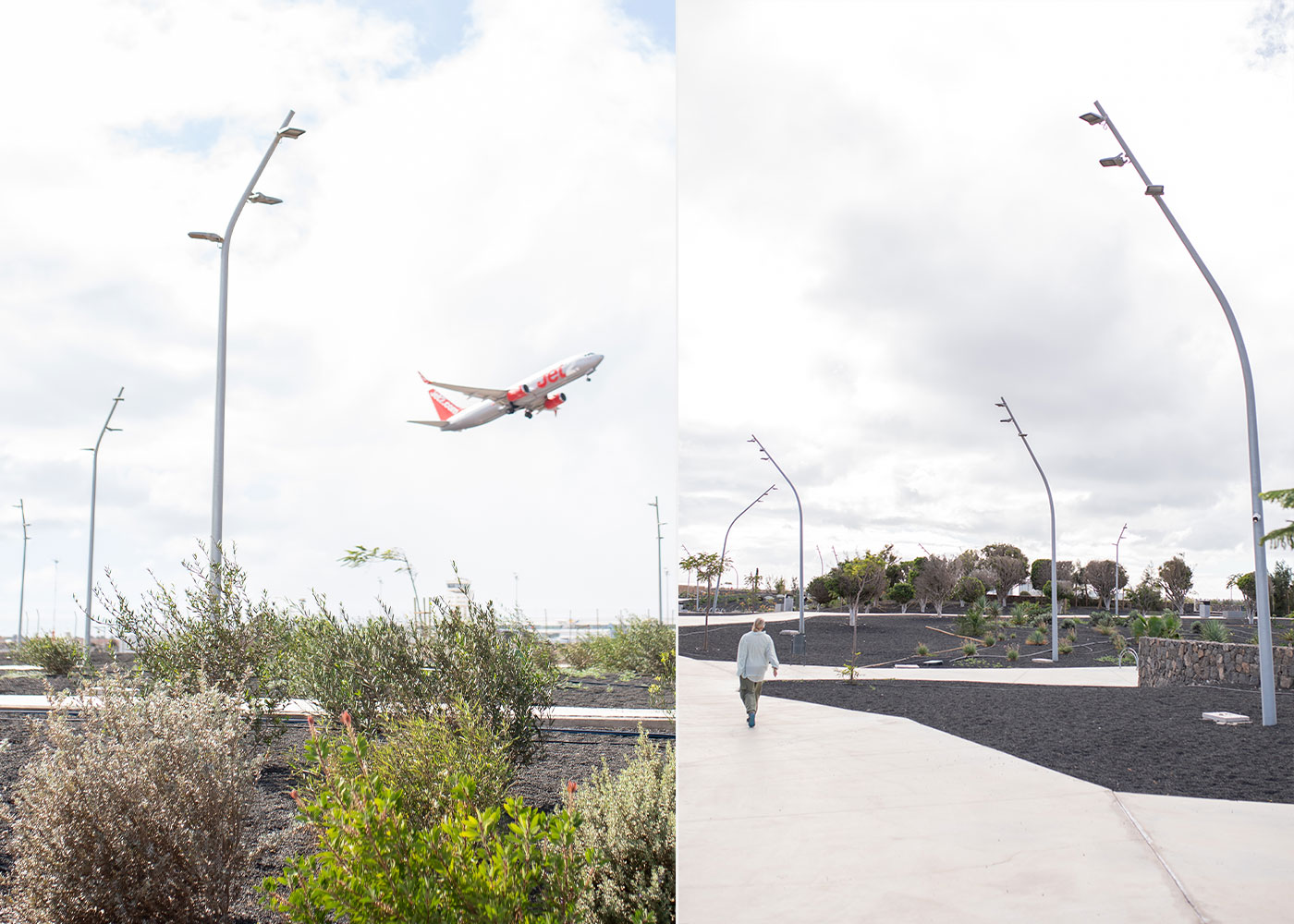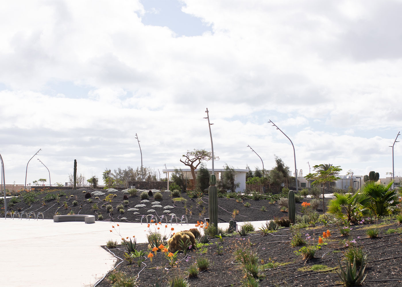 Parc renovat integralment a Playa Honda, entre l’aeroport i el nucli urbà, amb projectors MILAN orientables i aparcabicicletes OMEGA per fomentar la mobilitat sostenible.