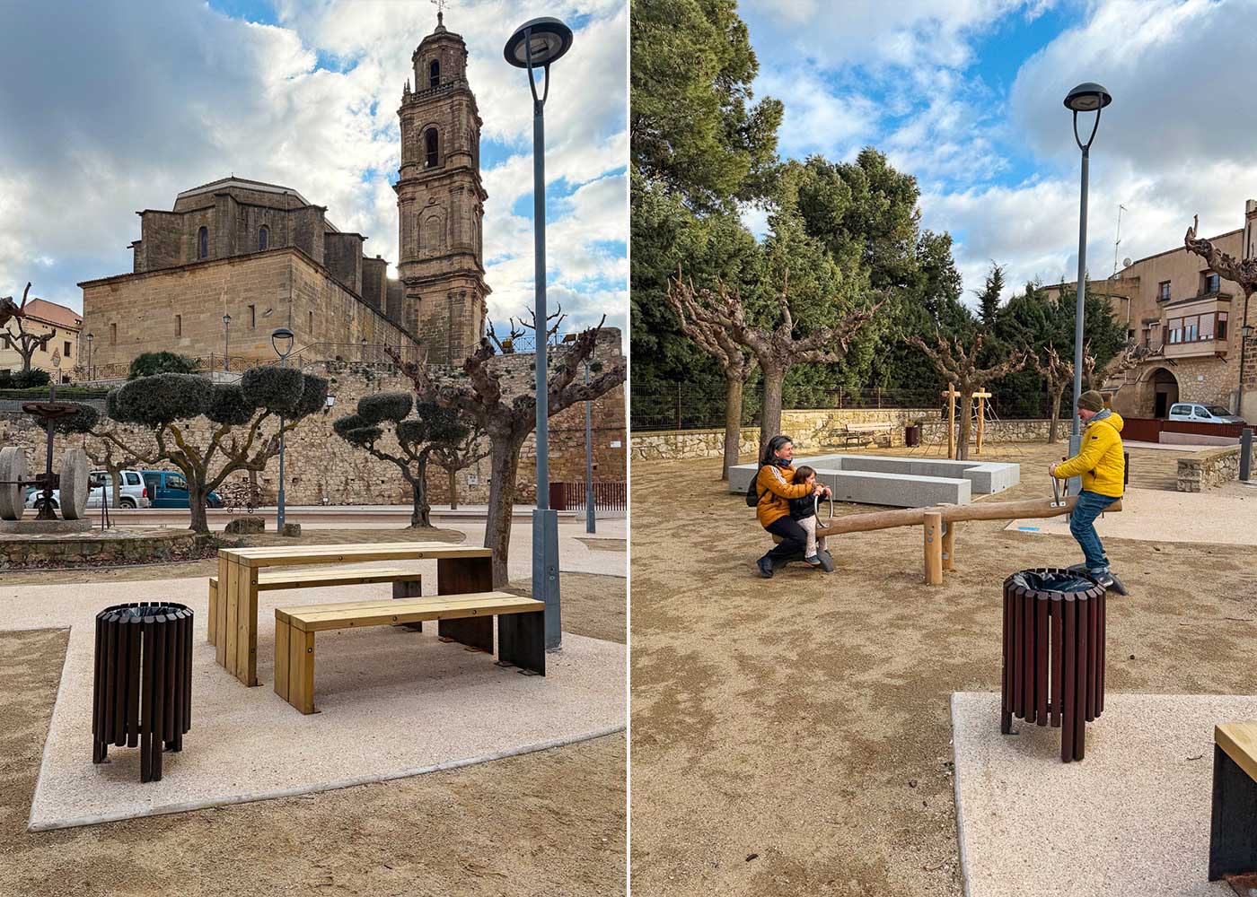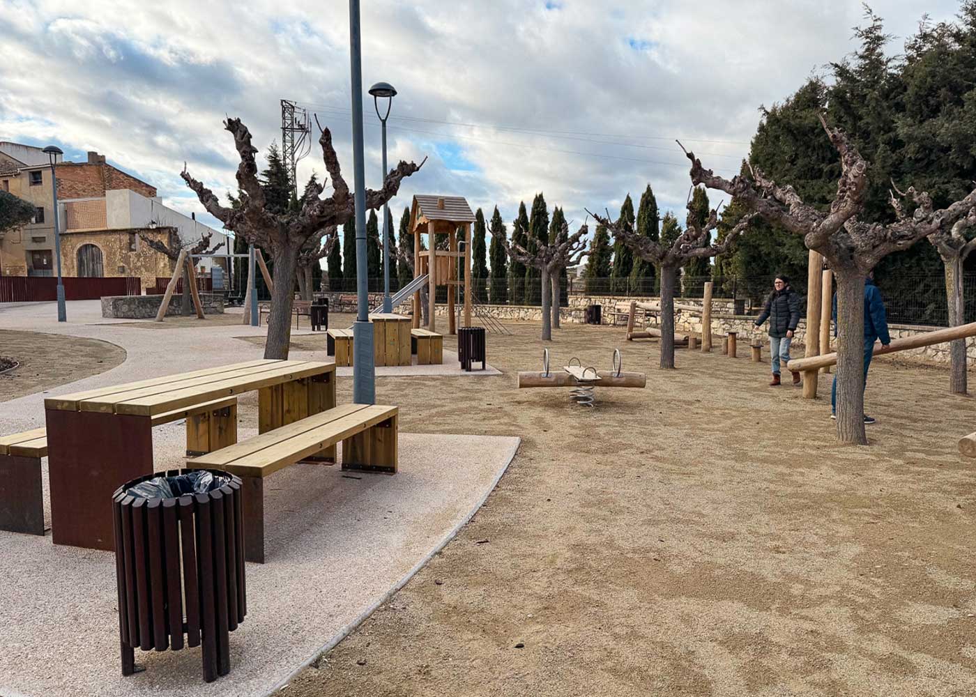 El projecte també contempla zones d’estada per a adults, amb la instal·lació de taules de pícnic Gavarres, bancs Minsk, papereres Salou i bancs Kube de formigó, configurant un entorn còmode i resistent a l’ús intensiu.