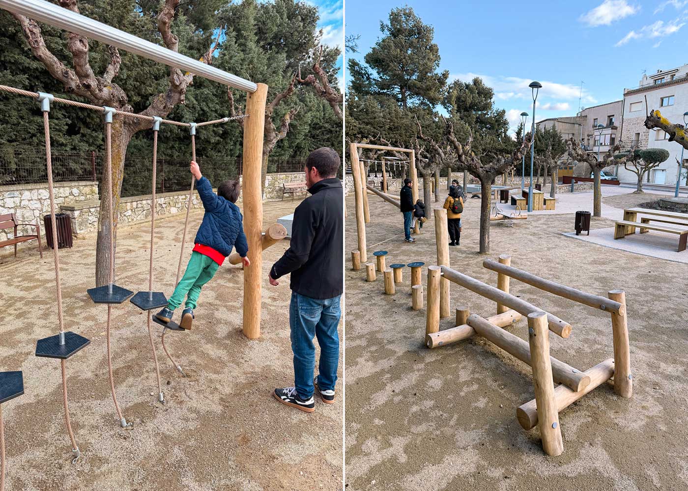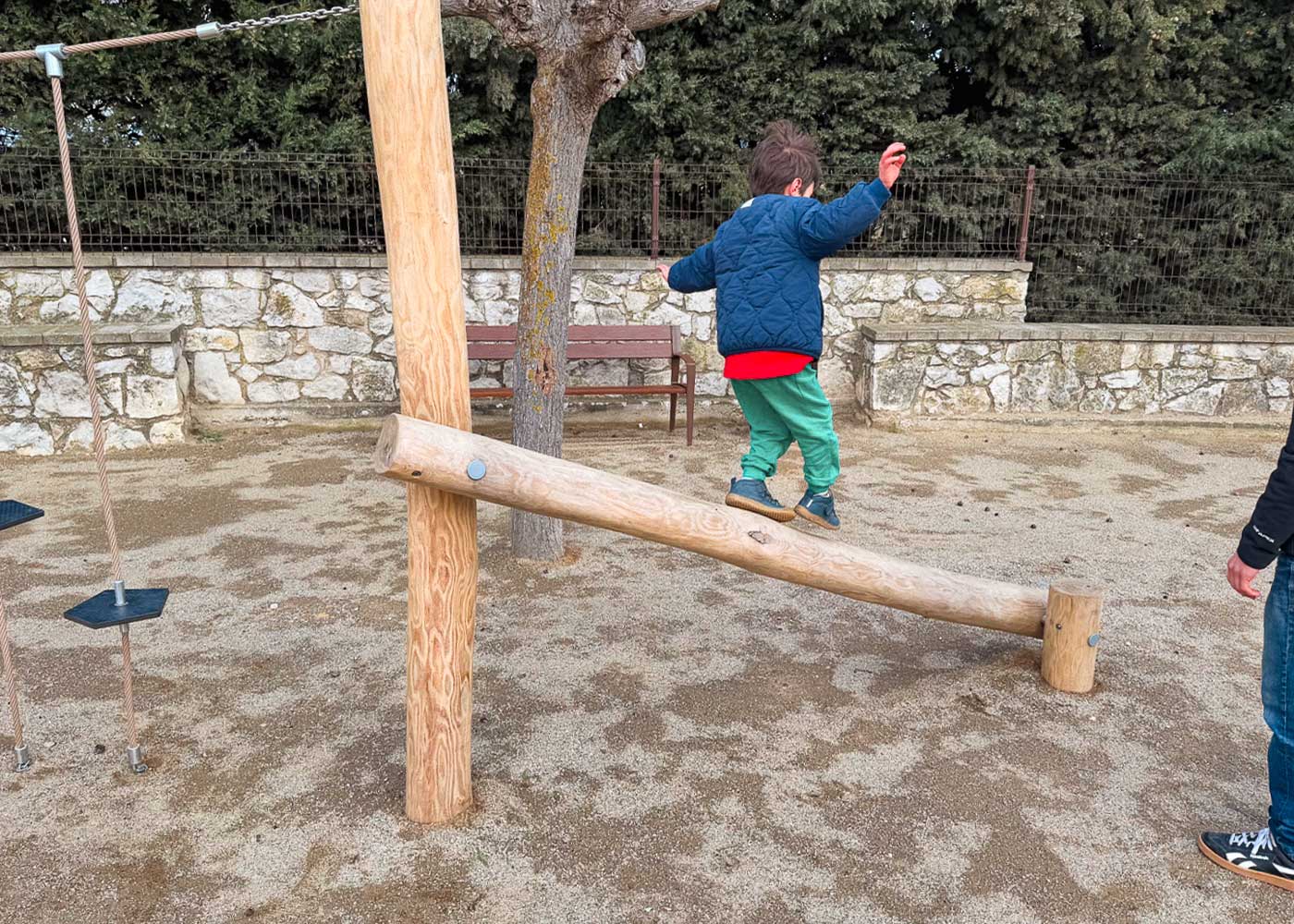 El nou parc infantil incorpora jocs d’estructura en fusta de robínia, un material que afavoreix la seva integració en l’entorn i reforça el caràcter natural de l’espai. La zona lúdica es completa amb jocs modulars, elements d’equilibri per als més petits i balancins, creant una àrea dinàmica que estimula el desenvolupament i la socialització.