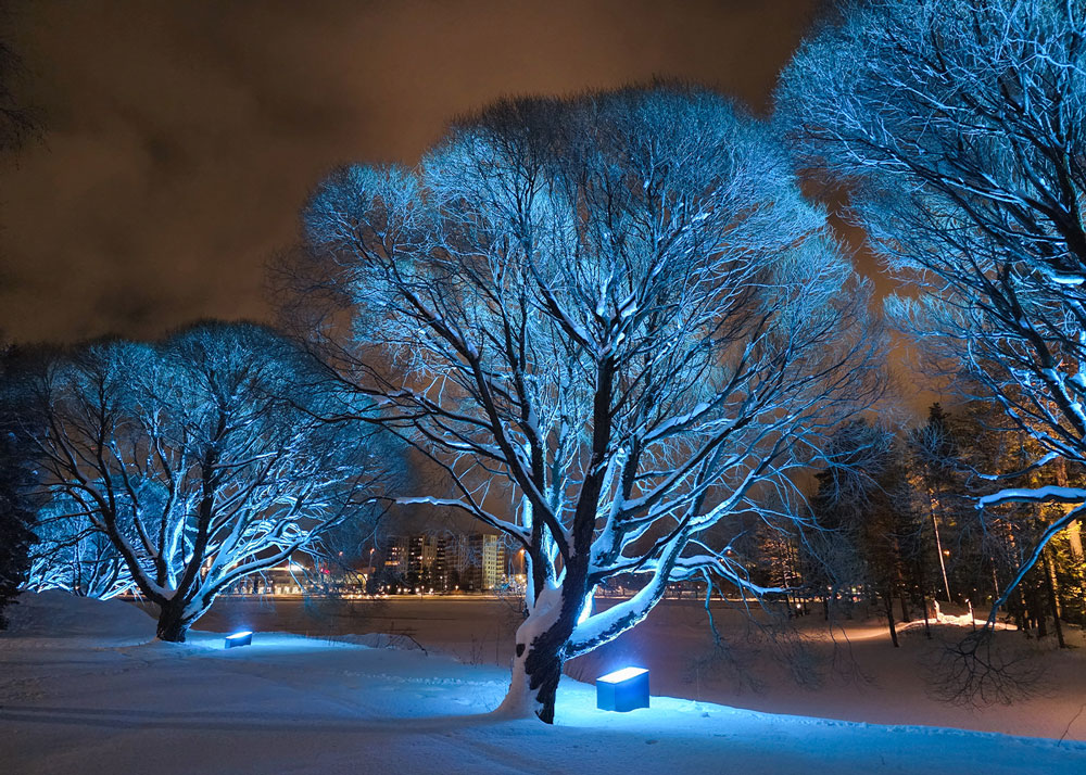 Instal·lació de lluminàries Milan XL RGBW a la vall del riu Sipinen, Kajaani (Finlàndia), un projecte d’il·luminació paisatgística que realça l’entorn natural i millora l’experiència nocturna.