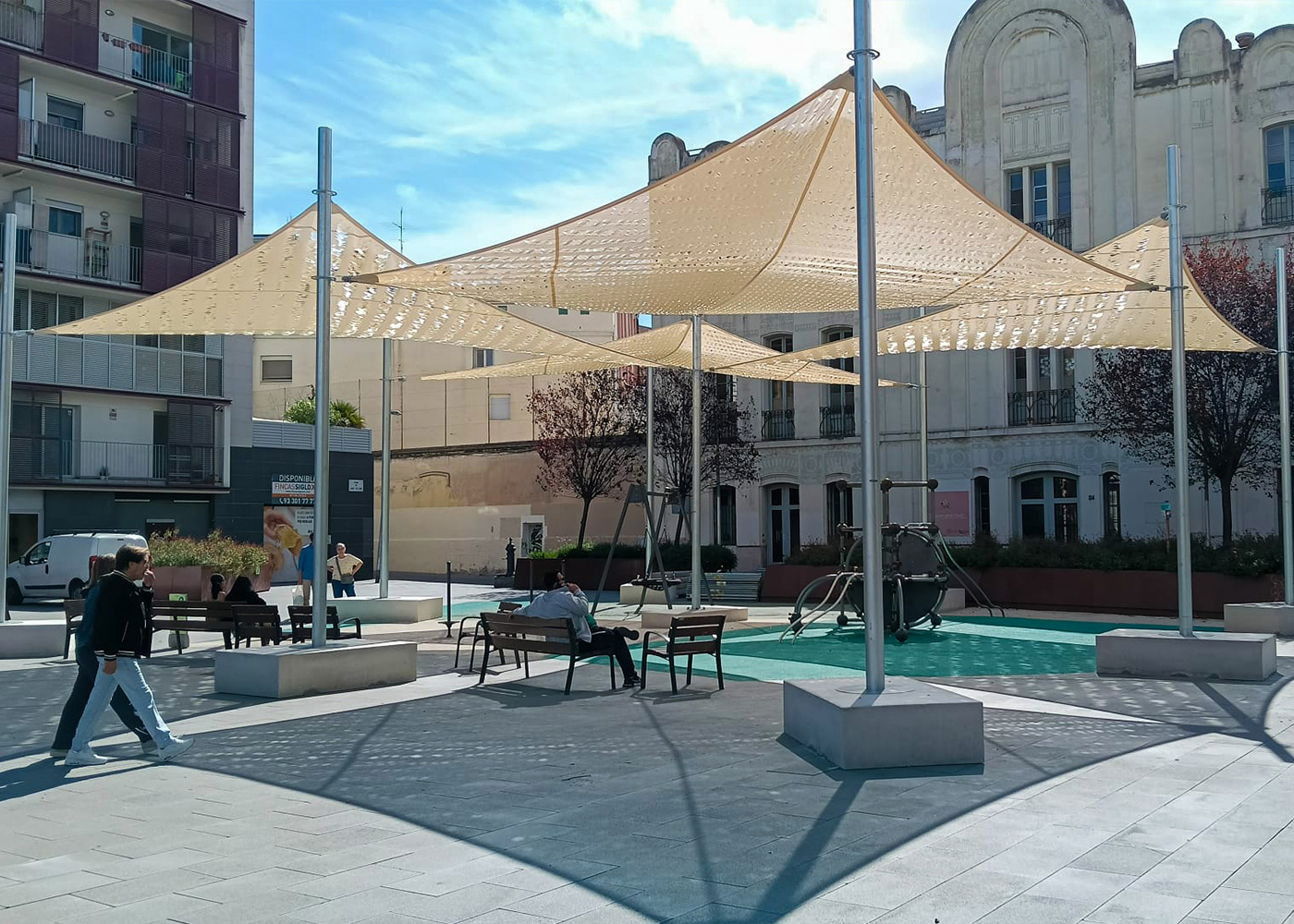 Instalación de velas textiles en la Plaça Joan Pelegrí (Barcelona), generando zonas de sombra y confort climático mediante estructuras ligeras y materiales permeables que favorecen la ventilación.