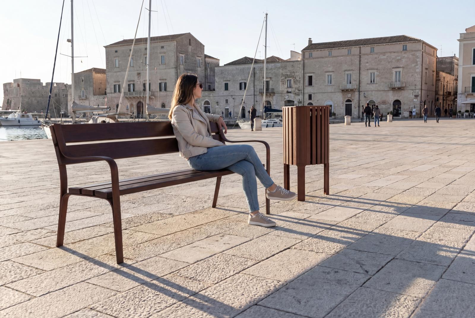 Banco de diseño CITIZEN ECO, medidas totales (largo x alto x profundo) 1800x810x650 mm, fabricado en plástico ReBnew (el polímero reciclado de BENITO que está producido íntegramente a partir de envases del contenedor amarillo y no requiere ningún tipo de mantenimiento) tanto los piés como el asiento y el respaldo con refuerzo de sección cuadrada metálico en el asiento para mayor resistencia estructural.Un banco al que no le afecta ni la humedad ni la corrosión. Tornillería de acero inoxidable. Preparado para anclaje con pernos de expansión M10 según superficie y proyecto.