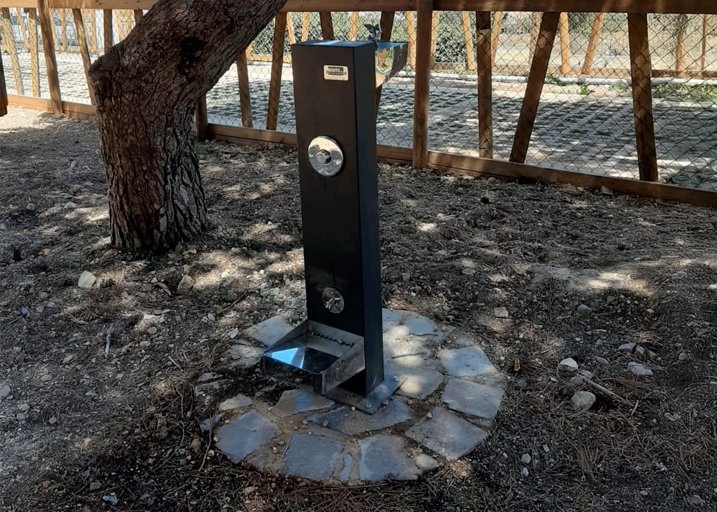 Fuente de diseño HUSKY, medidas totales (largo x alto) 300x1010 mm, fabricada en acero (tratado con el proceso Ferrus el protector de triple capa para el hierro, que garantiza una óptima resistencia a la corrosión), cubetas de acero inoxidable AISI 304 acabado satinado (altura de la cubeta baja: 200 mm, altura de la cubeta alta: 980 mm), con 2 grifos pulsadores a dos alturas, uno adaptado para perros, gritería ergonómica, ecológica. Preparada para anclaje con 4 pernos de expansión M8 según superficie y proyecto.