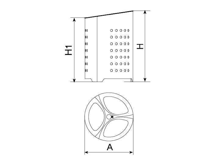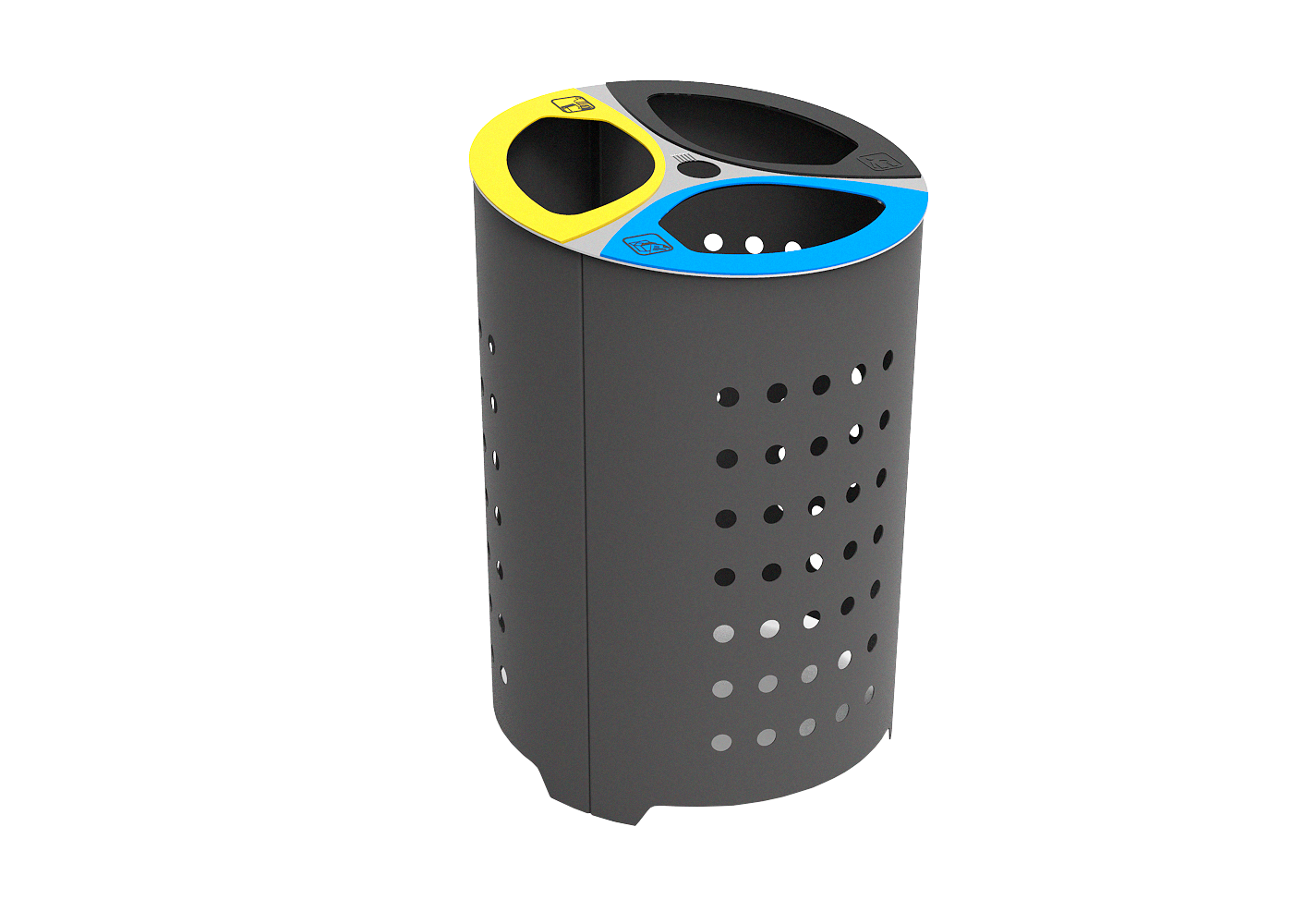 Papelera de diseño DORIA, medidas totales (Ø x alto 1 x alto 2) 620x910x820 mm, 3x75 litros, fabricada en chapa de acero galvanizada (tratado con el proceso Ferrus el protector de triple capa para el hierro, que garantiza una óptima resistencia a la corrosión), con cenicero central (con apaga cigarrillos y cubeta propia) y tres entradas de residuos distintas (con sistema para la sujeción de la bolsa), cada una marcada con el color y pictograma universal, identificativos del residuo. Cierre mediante llave triangular estándar, con sistema de bloqueo automático, para bolsas de 75 litros. Preparada para anclaje con 3 pernos de expansión Ø10 según superficie y proyecto.