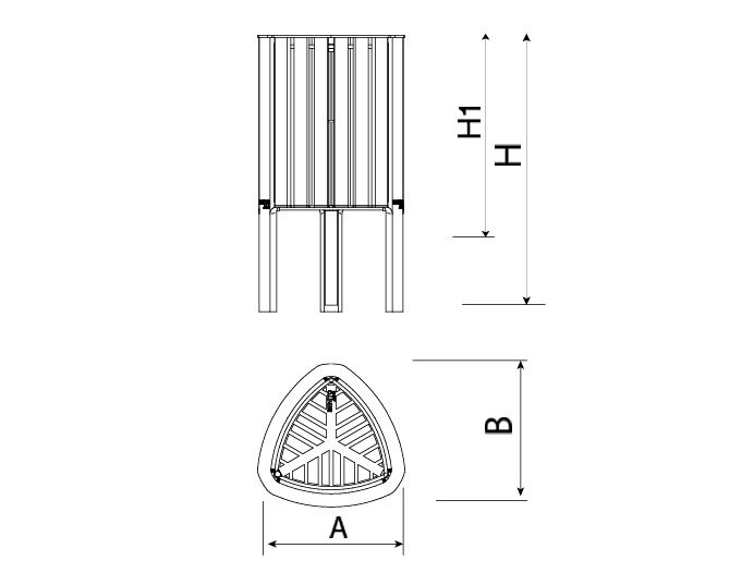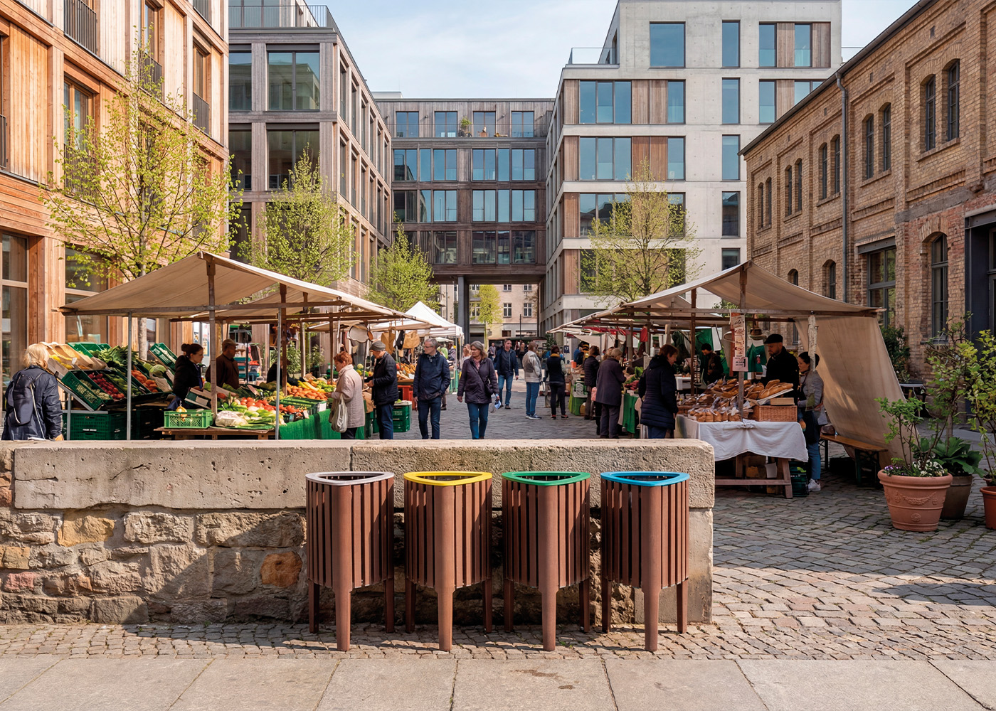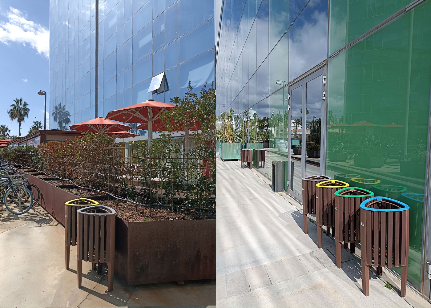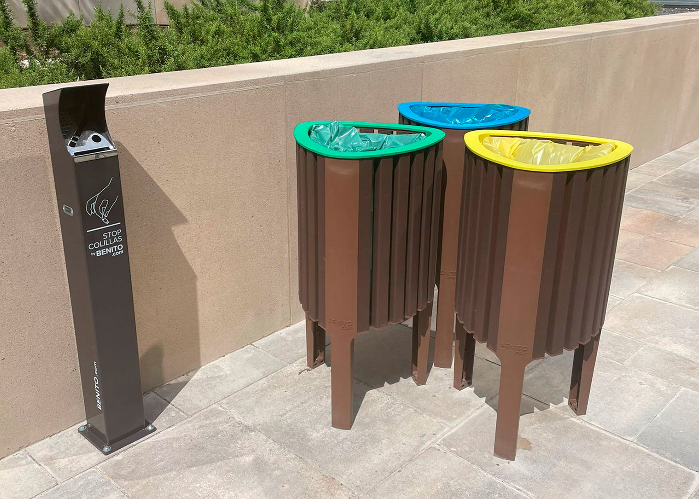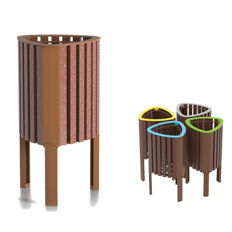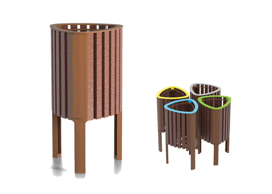 Papelera de diseño GEA en polímero reciclado, medidas totales (ancho x profundo x alto) 440x430x825 mm, compacta y adaptable con aro sujeta bolsas pensado para bolsas de 50 litros, fabricada en plástico ReBnew (el polímero reciclado de BENITO que está producido íntegramente a partir de envases del contenedor amarillo y no requiere ningún tipo de mantenimiento). Preparada para anclaje con tornillos según superficie y proyecto.