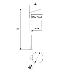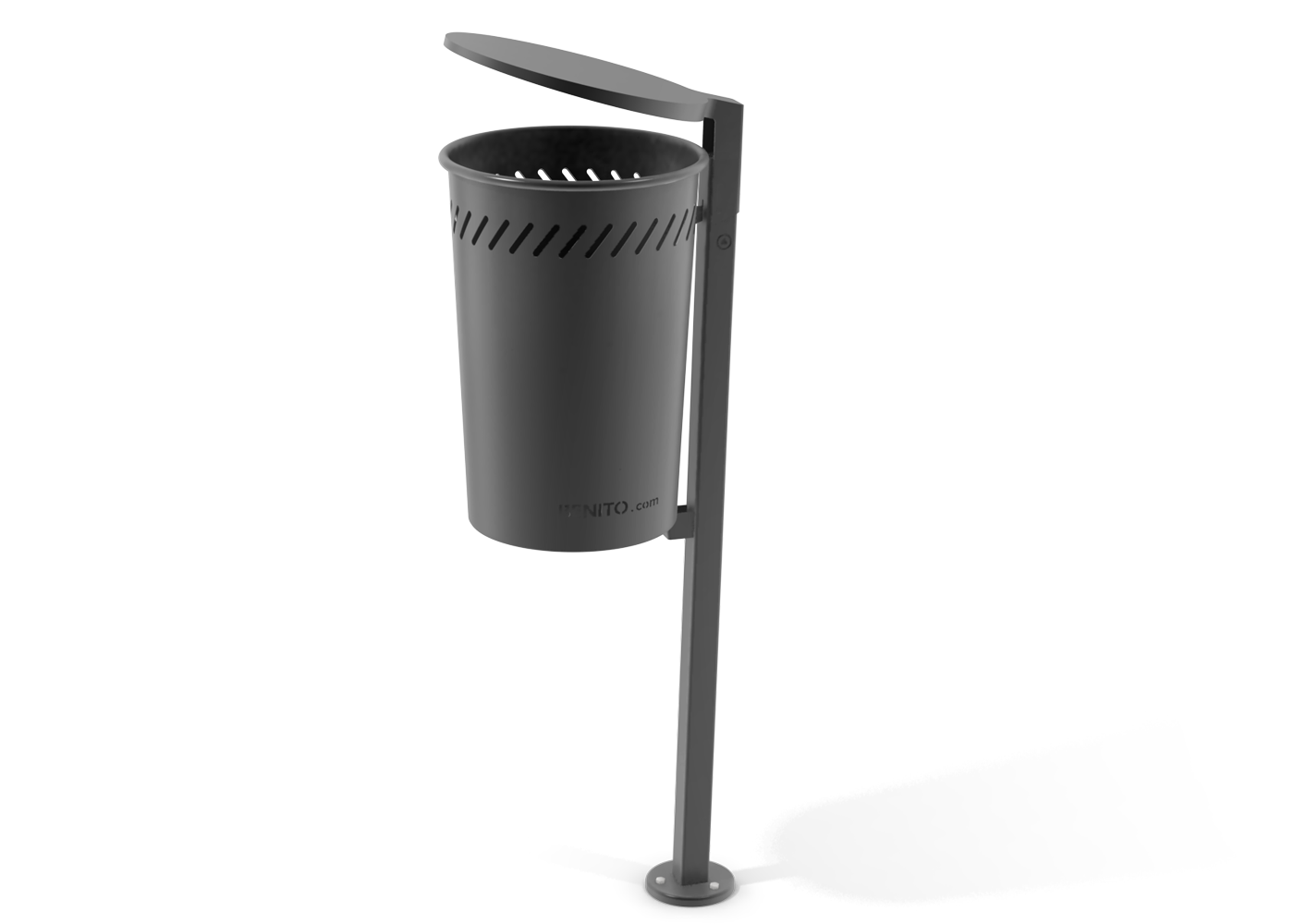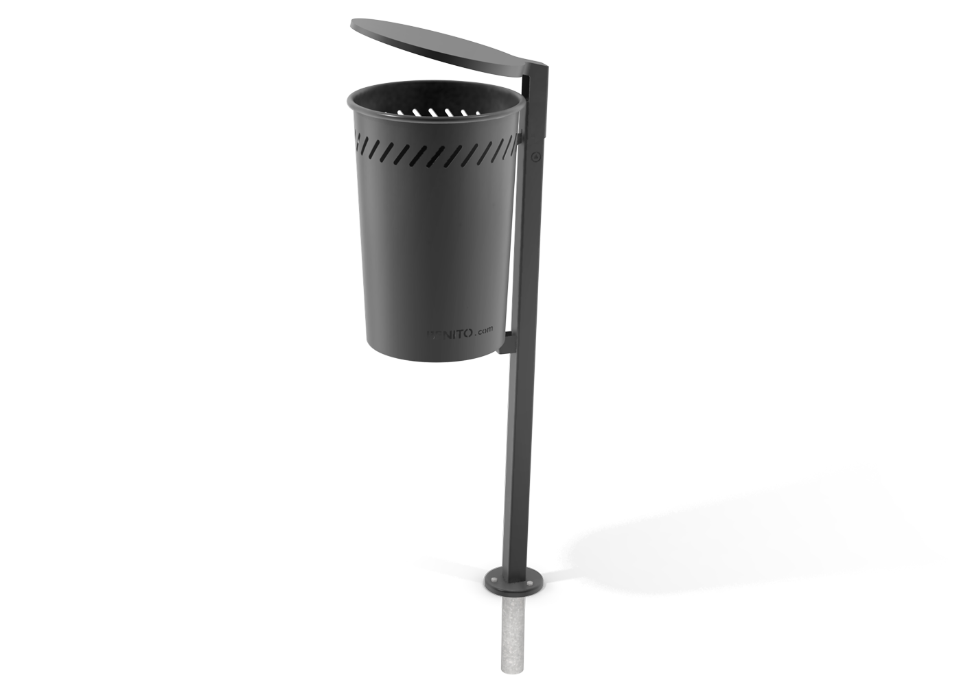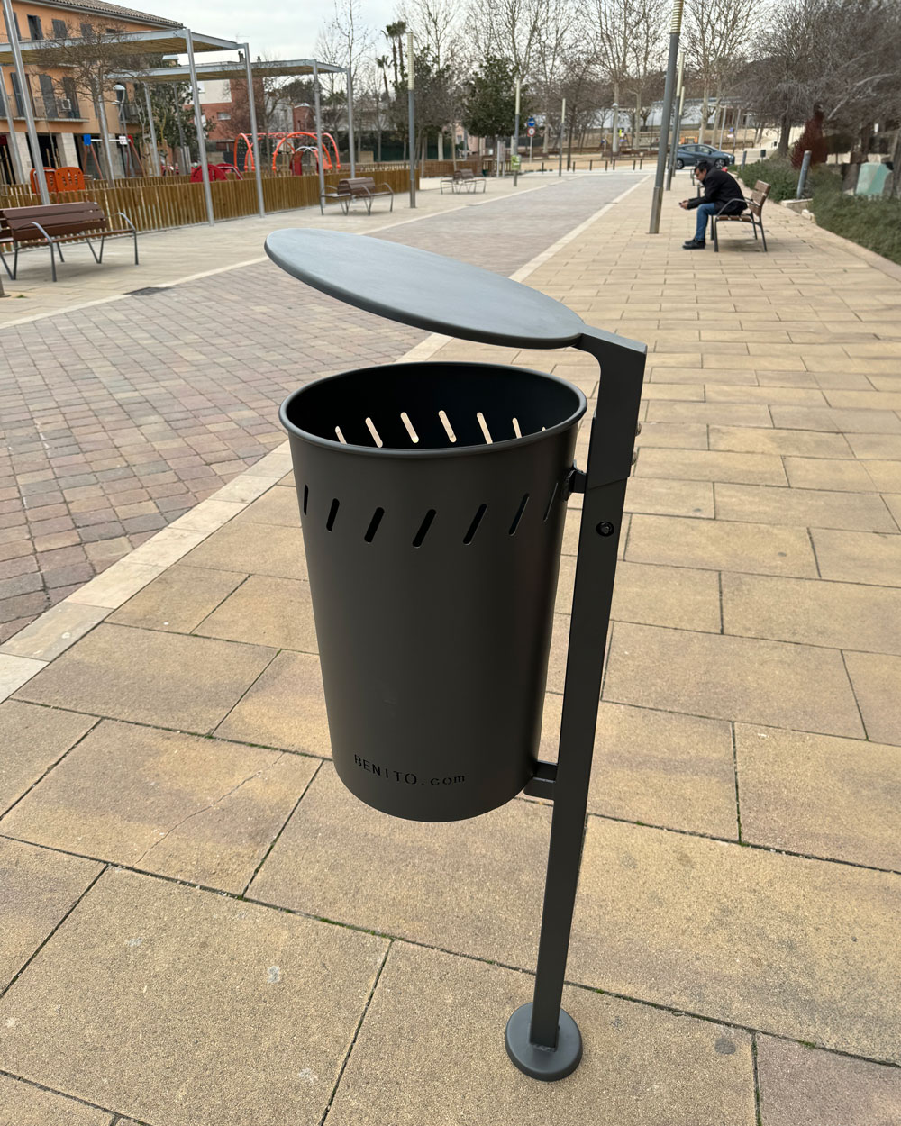 Papelera fabricada con cubeta abatible de acero, con franjas reservando un espacio central para mayor robustez o posibles marcajes. Acabado con tratamiento Ferrus, proceso protector del hierro que garantiza una óptima resistencia a la corrosión.