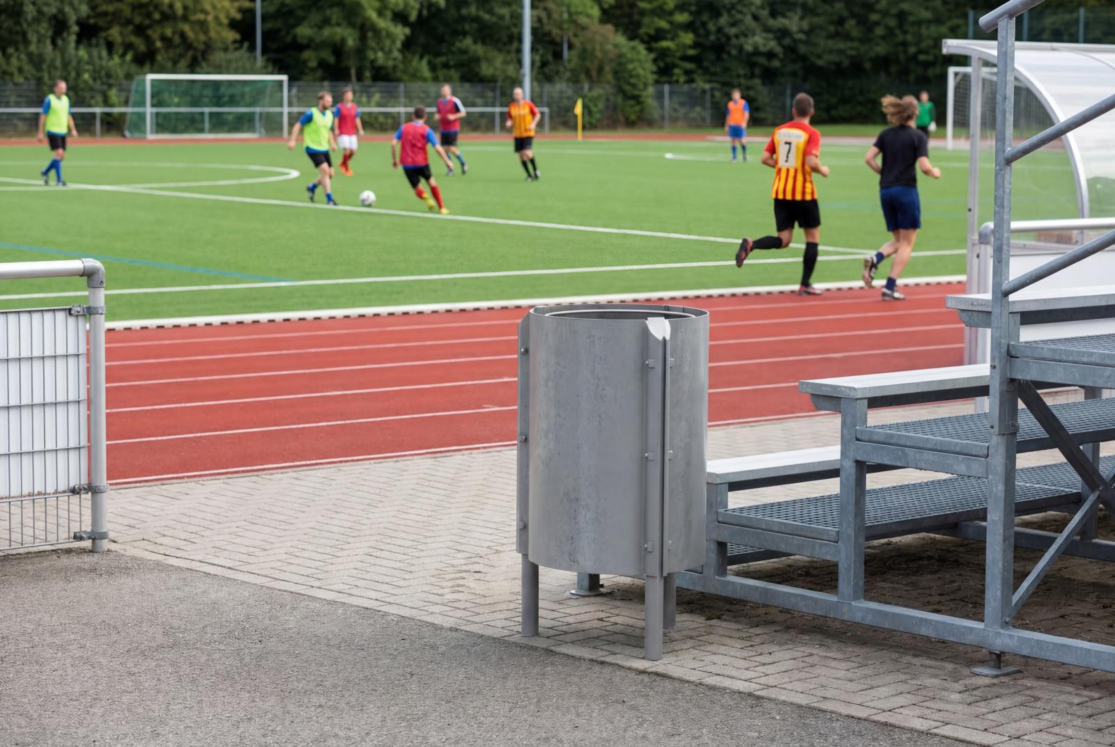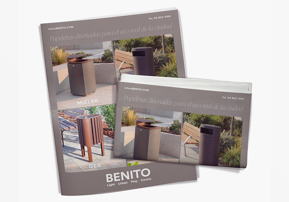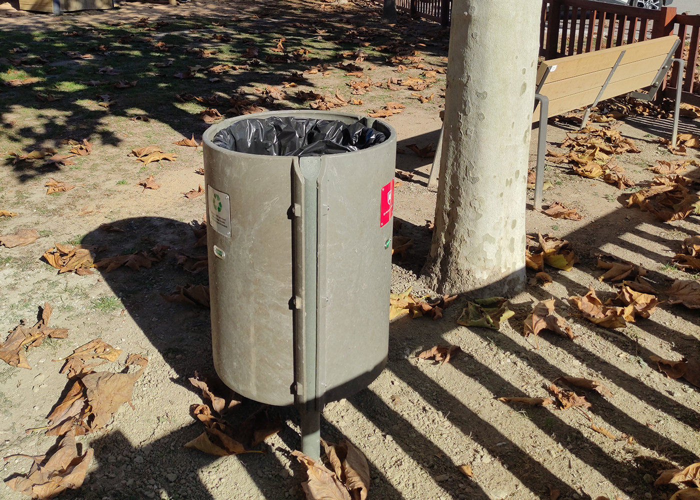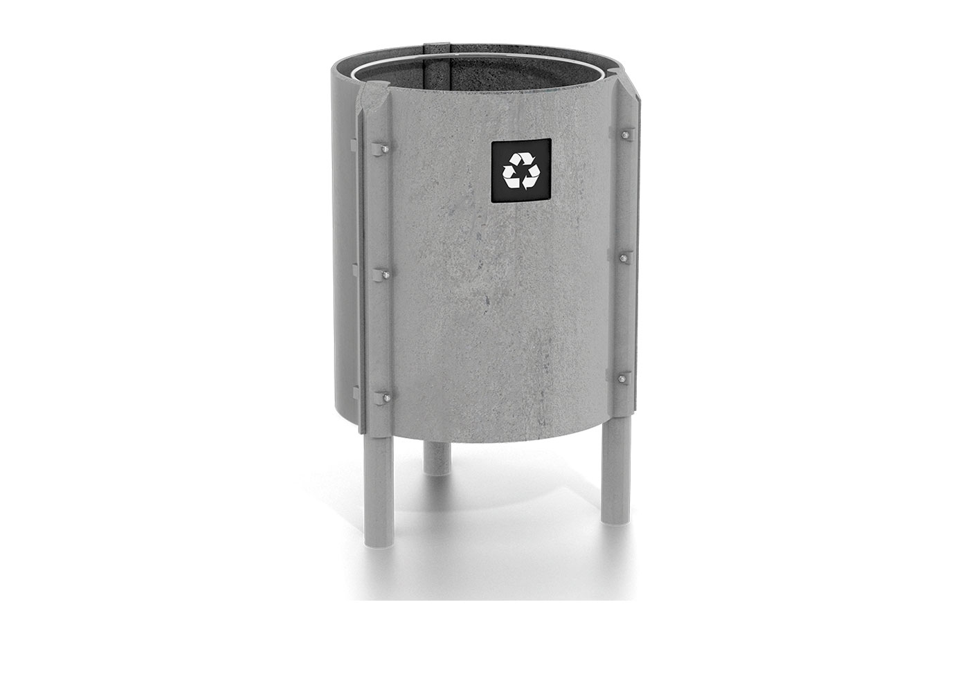 Papelera de diseño RELEU con aro, diseño antivandalico, medidas totales (Ø x alto) 450x800 mm, 90 litros, fabricado en plástico reciclado obtenido de la recogida selectiva urbana, 100% reciclado y reciclable, material durable, inalterable a la intemperie, resistente al agua y que NO requiere ningún tipo de mantenimiento. Preparada para anclaje con tornillos según superficie y proyecto.