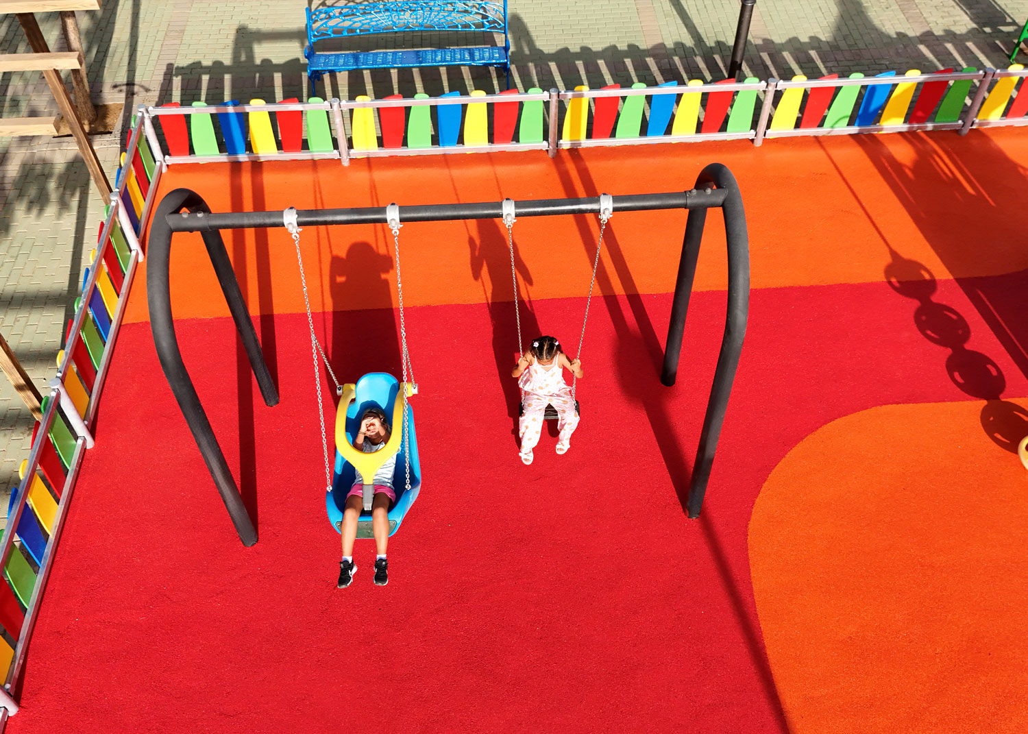 El uso de pavimento amortiguante multicolor y vallados decorativos convierte este espacio en un entorno alegre y seguro, perfectamente integrado en el tejido urbano de Aljaraque.