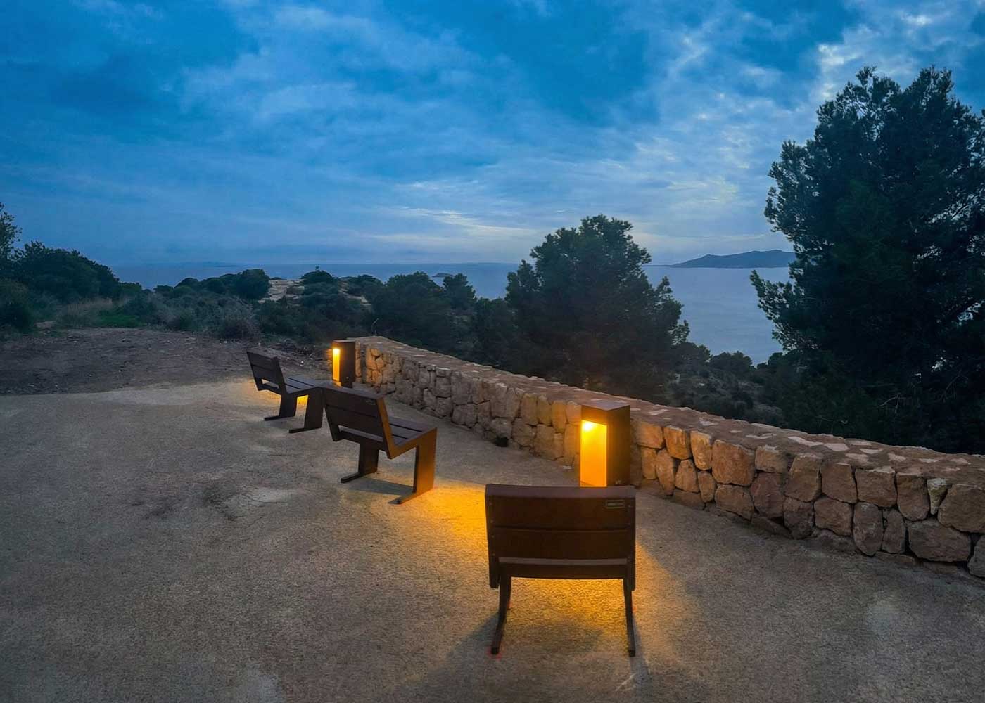 El renovado Camí del Calvari en Ibiza, inaugurado tras una inversión de 2,5 M€, mejora el acceso a Dalt Vila con mobiliario urbano de Benito: sillas Quatro y balizas Mar.