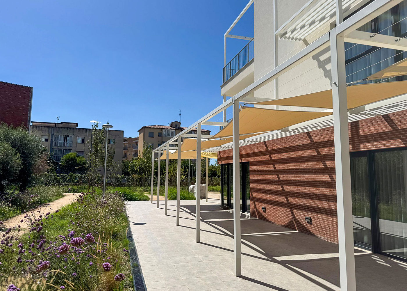 Renovación en Vilafranca del Penedés (Barcelona) con red CUAT para niños, mesas picnic Rebnew y pérgolas Kalahari con techo transpirable, creando un espacio de descanso ideal para el verano.
