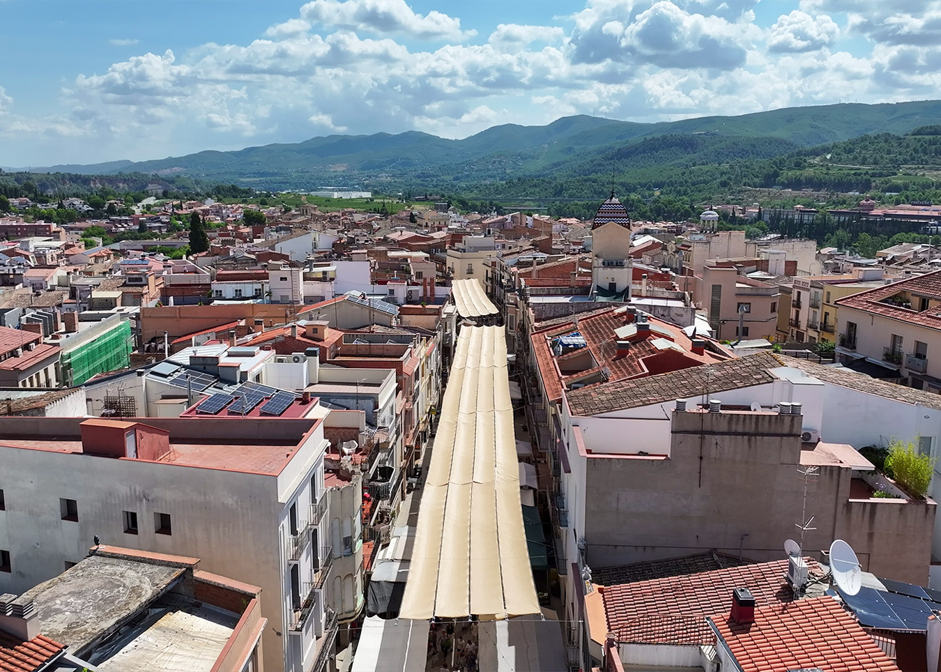 En el pequeño pueblo de Castellolí se han instalado velas triangulares frente al ayuntamiento para generar sombra y crear espacios frescos durante las olas de calor en verano.