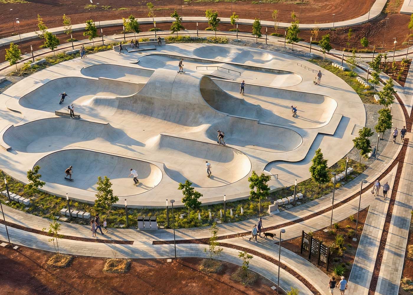 El nuevo mobiliario del Parque Ecológico Lago de Texcoco incluye sillas y papeleras Kube, tumbonas Petrus y jardineras Lisa en hormigón, junto con luminarias Stark y canchas Benito.