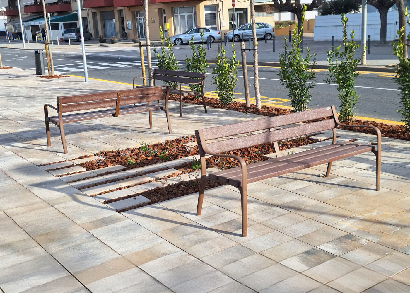Banco de diseño CITIZEN ECO, medidas totales (largo x alto x profundo) 1800x810x650 mm, fabricado en plástico ReBnew (el polímero reciclado de BENITO que está producido íntegramente a partir de envases del contenedor amarillo y no requiere ningún tipo de mantenimiento) tanto los piés como el asiento y el respaldo con refuerzo de sección cuadrada metálico en el asiento para mayor resistencia estructural.Un banco al que no le afecta ni la humedad ni la corrosión. Tornillería de acero inoxidable. Preparado para anclaje con pernos de expansión M10 según superficie y proyecto.