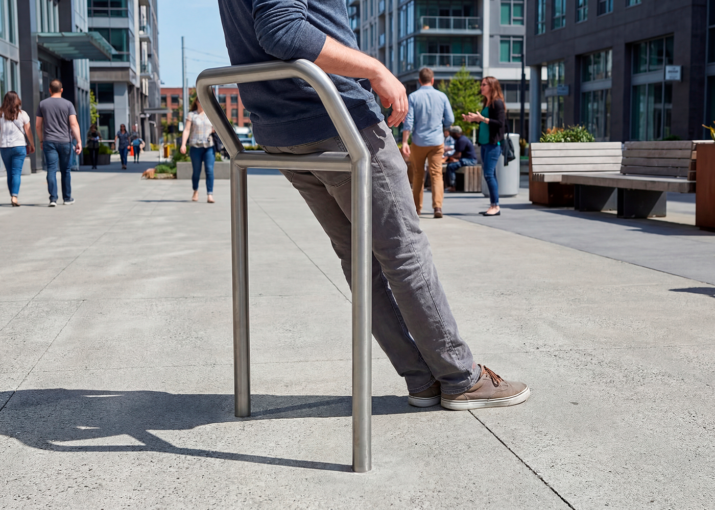 Apoyo isquiático urbano de diseño minimalista, estructura tubular continua en acero galvanizado tratado mediante el proceso Ferrus, un protector de triple capa para el hierro que garantiza una óptima resistencia a la corrosión, con formas redondeadas y líneas suaves, compuesto por dos patas verticales y una barra superior horizontal ergonómica ligeramente inclinada.Acabado en pintura color RAL 9006 superficie uniforme y de alta calidad. Opcional acabado en acero inoxidable. Preparada para anclaje empotrado en el suelo.