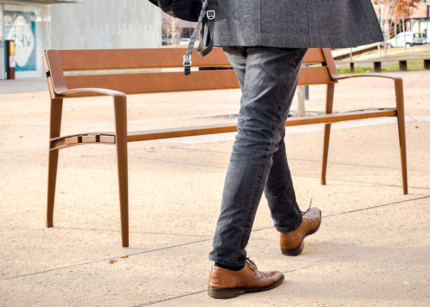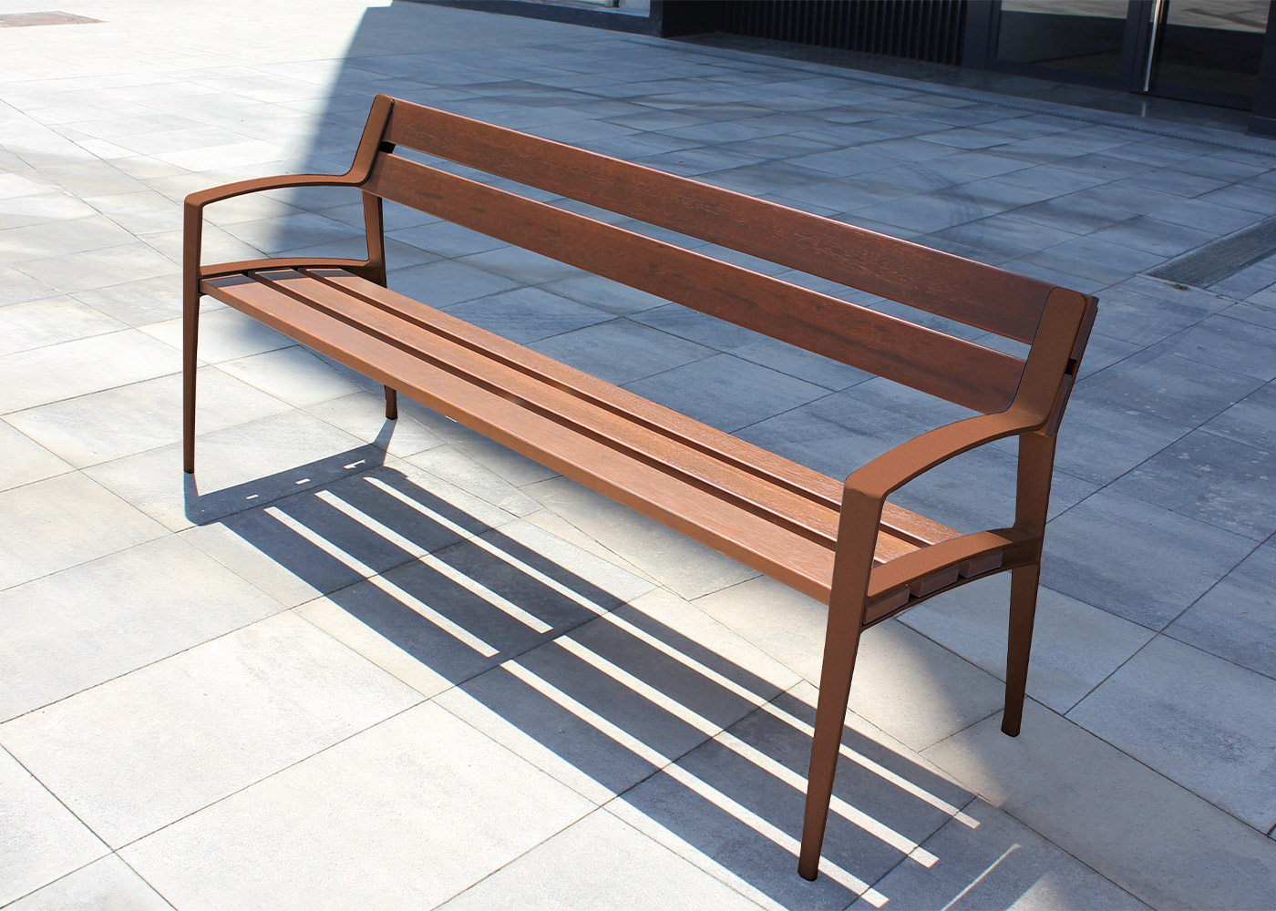 Banco de diseño MINSK de, medidas totales (largo x alto x profundo) 1800x820x590 mm, fabricado con pies de fundición dúctil (tratados con el proceso Ferrus el protector de triple capa para el hierro, que garantiza una óptima resistencia a la corrosión). Acabado imprimación epoxi y pintura poliéster en polvo color marson. Cinco tablones de madera tropical natural (tratados con recubrimiento de triple capa Lignus, protector fungicida, insecticida e hidrófugo). Estructura de fundición de diseño envolvente, para proteger la fijación del tablón ante posibles impactos. Tornillería de acero inoxidable. Preparado para anclaje con pernos de expansión M10 según superficie y proyecto.