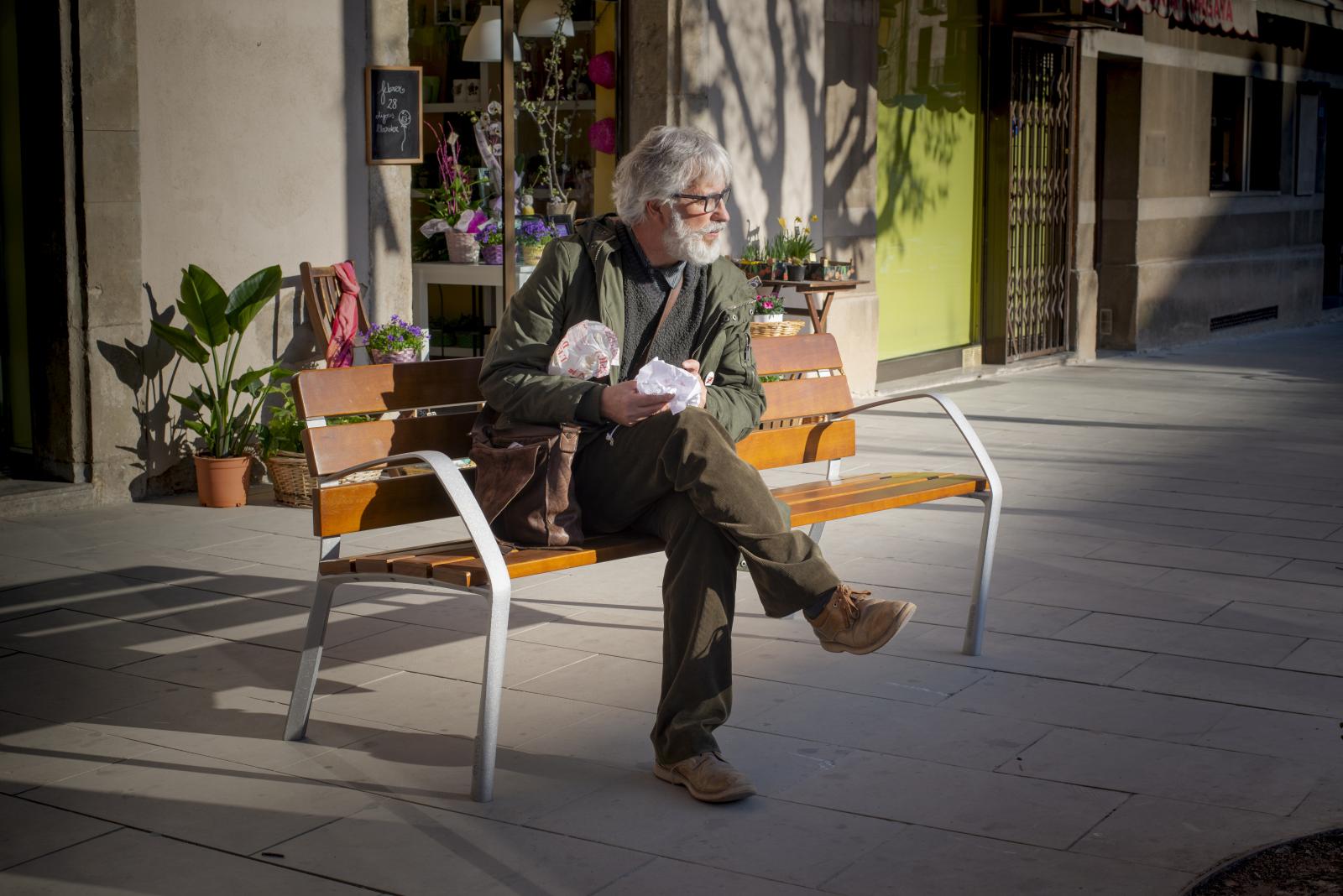 Banco de diseño NEOBARCINO, de 1800 mm de largo con asiento segun normativa de accesibilidad de 450 mm de alto y apoyabrazos, de diseño sobrio y elegante, fabricado con pies de fundición dúctil (tratados con el proceso Ferrus el protector de triple capa para el hierro,que garantiza una óptima resistencia a la corrosión). Acabado imprimación epoxi y pintura poliéster en polvo color gris martelé. Seis tablones de madera tropical natural (tratados con recubrimiento de triple capa Lignus, protector fungicida, insecticida e hidrófugo). Tornillería de acero inoxidable. Anclaje recomendado, mediante cuatro pernos de expansión M10 según superficie y proyecto.