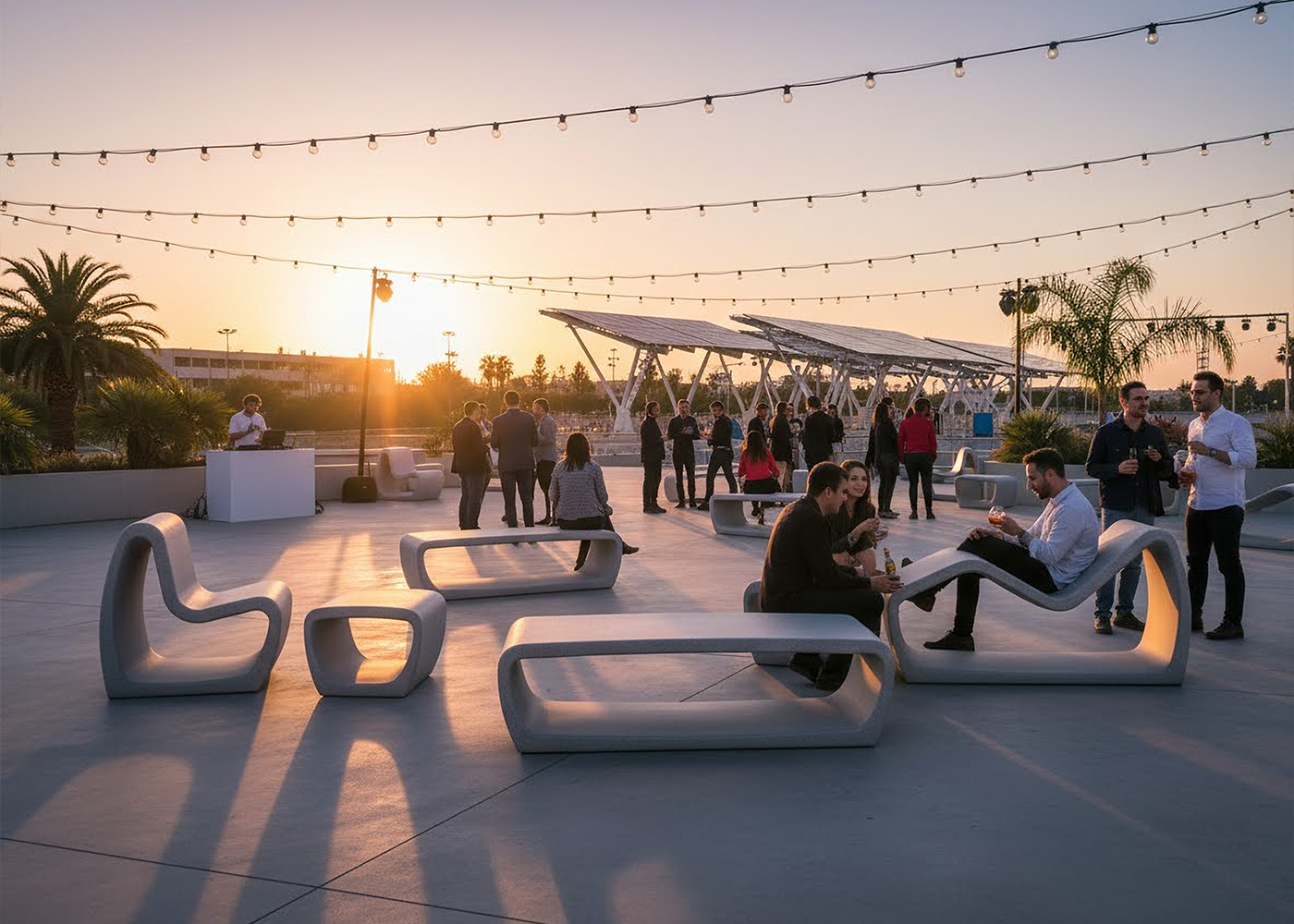 Banco de diseño PETRUS, medidas totales (largo x alto x profundo) 1640x470x610 mm, fabricado con prefabricado de hormigón color gris granítico de aspecto rugoso. Se puede colocar en forma de elementos aislados o en grupos. Apoyado sobre superficie preparada, por su propio peso.