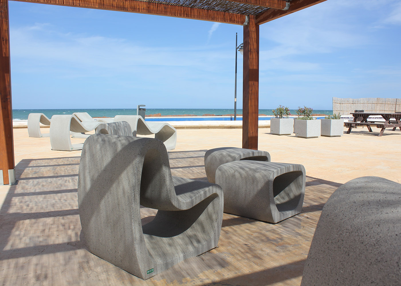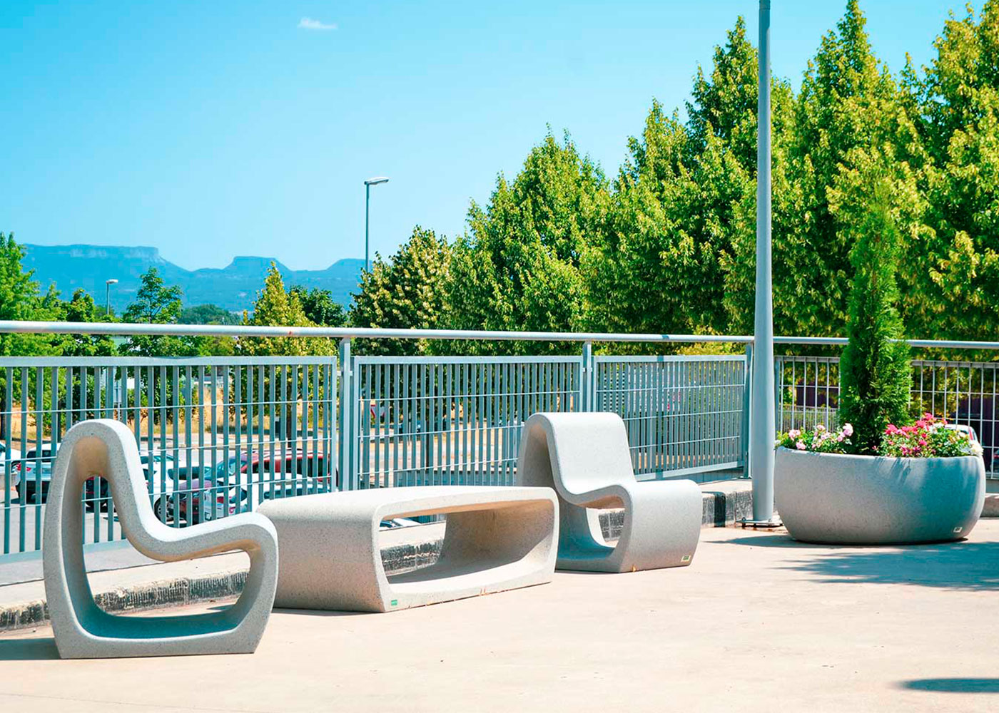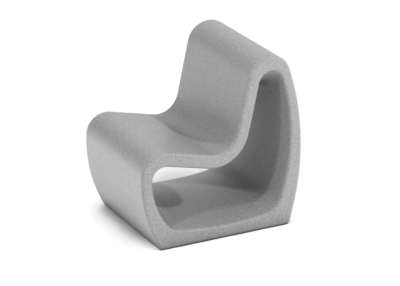 Silla de diseño PETRUS con respaldo, medidas totales (largo x alto x profundo) 600x820x800 mm, fabricado con prefabricado de hormigón color gris granítico de aspecto rugoso. Se puede colocar en forma de elementos aislados o en grupos. Apoyado sobre superficie preparada, por su propio peso.