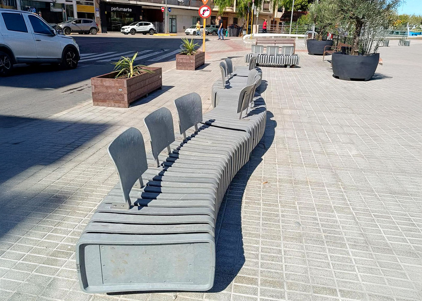 Banco de diseño VERTEBRA curvo con tres respaldos, medidas totales (largo x ancho x profundo) 2000x795x610 mm. Además de su flexibilidad geométrica y funcional, esta fabricado en plástico ReBnew (el polímero reciclado de BENITO que está producido íntegramente a partir de envases del contenedor amarillo y no requiere ningún tipo de mantenimiento) tanto los piés como el asiento y el respaldo. Con un agradable tacto al uso. Preparado para anclaje con tornillos según superficie y proyecto.