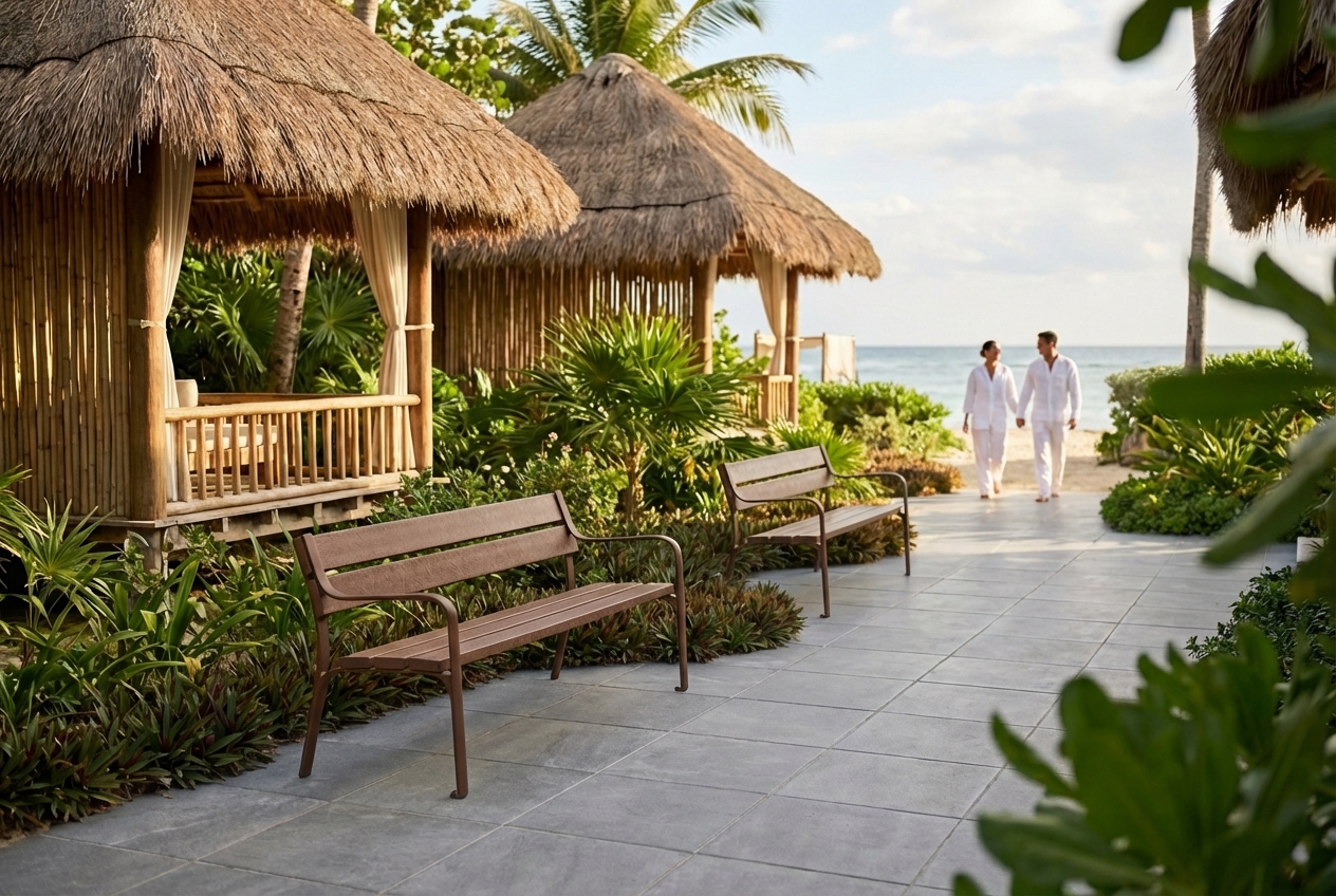 Banco de diseño CITIZEN ECO, medidas totales (largo x alto x profundo) 1800x810x650 mm, fabricado en plástico ReBnew (el polímero reciclado de BENITO que está producido íntegramente a partir de envases del contenedor amarillo y no requiere ningún tipo de mantenimiento) tanto los piés como el asiento y el respaldo con refuerzo de sección cuadrada metálico en el asiento para mayor resistencia estructural.Un banco al que no le afecta ni la humedad ni la corrosión. Tornillería de acero inoxidable. Preparado para anclaje con pernos de expansión M10 según superficie y proyecto.