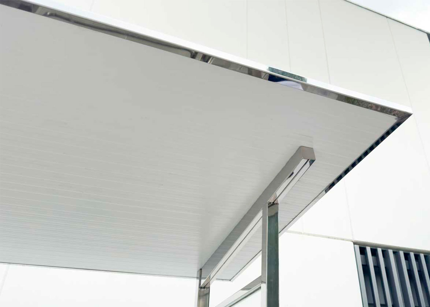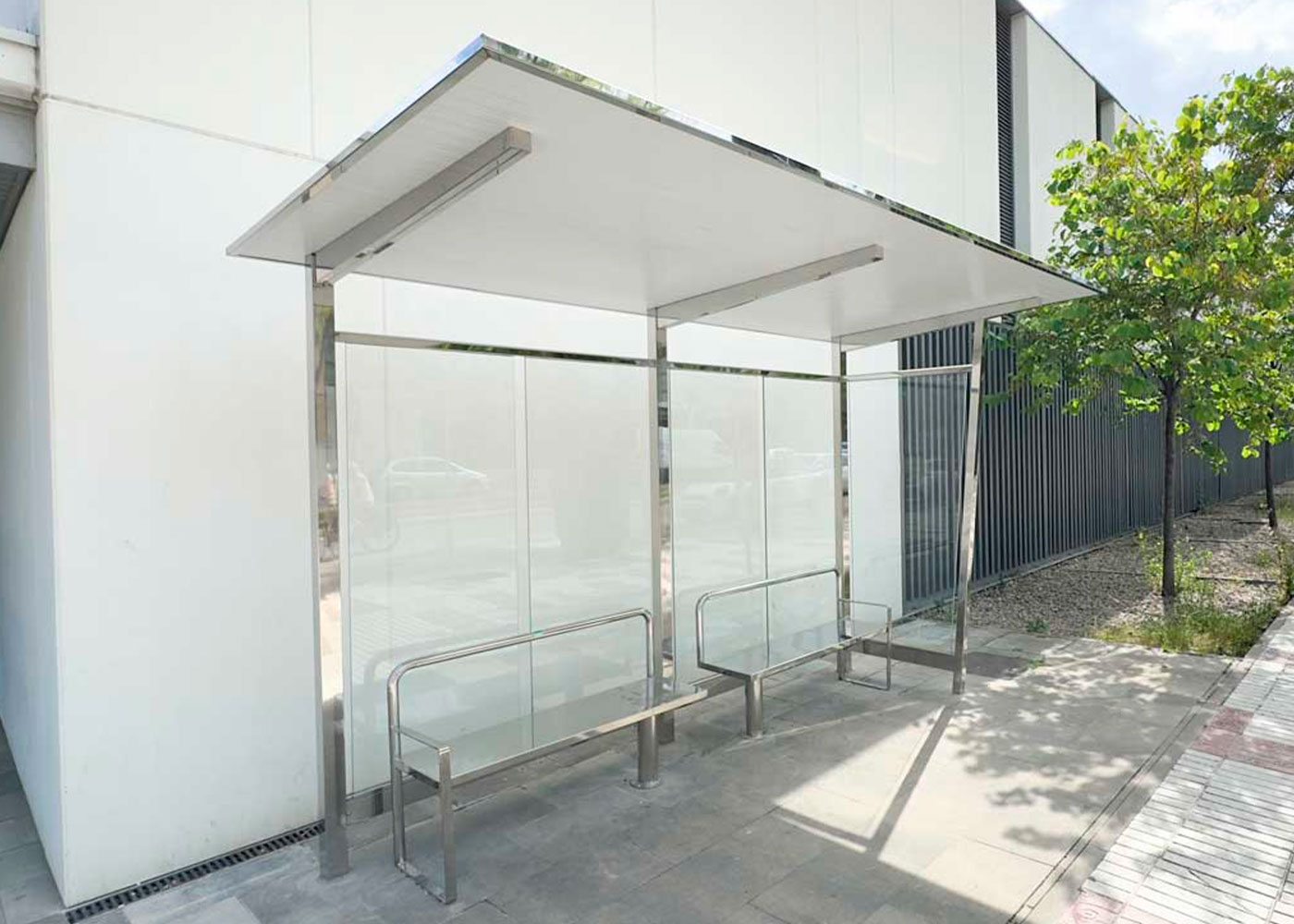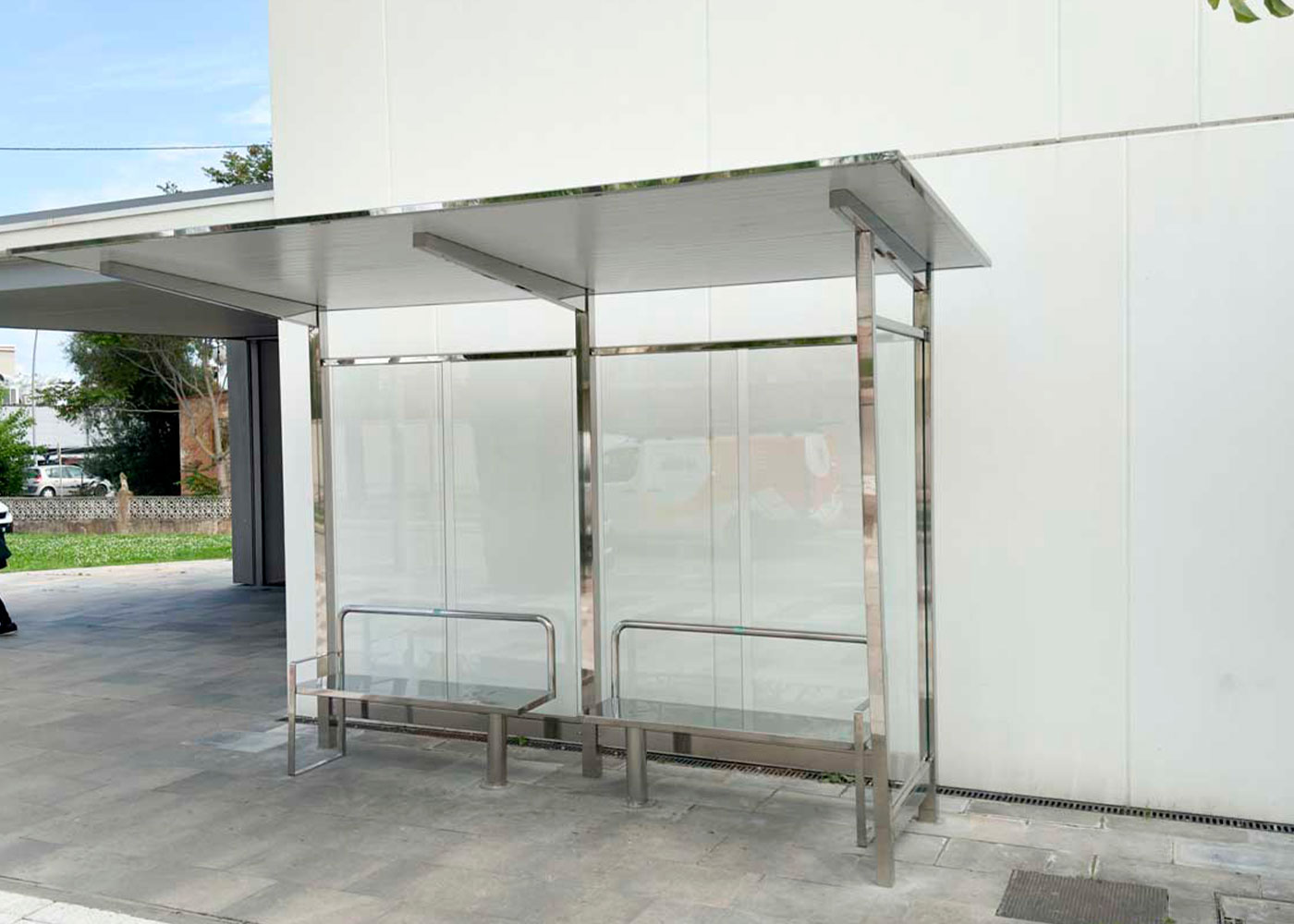 Marquesina con banco sin laterales STIL, medidas totales (largo x ancho x alto) 4000x2696x2020 mm, fabricada en acero inoxidable AISI-304 pulido brillante, con banco sin laterales. Panel tejado (inyectado poliuretano galvanizado y prelacado) con tres pilares de 80x80 mm, soporte para su fijación con escuadras y perfiles horizontales para cerramiento con cristal laminado de seguridad. Entregado en kit con accesorios e instrucciones de montaje. Anclaje recomendado: empotramiento en el suelo.