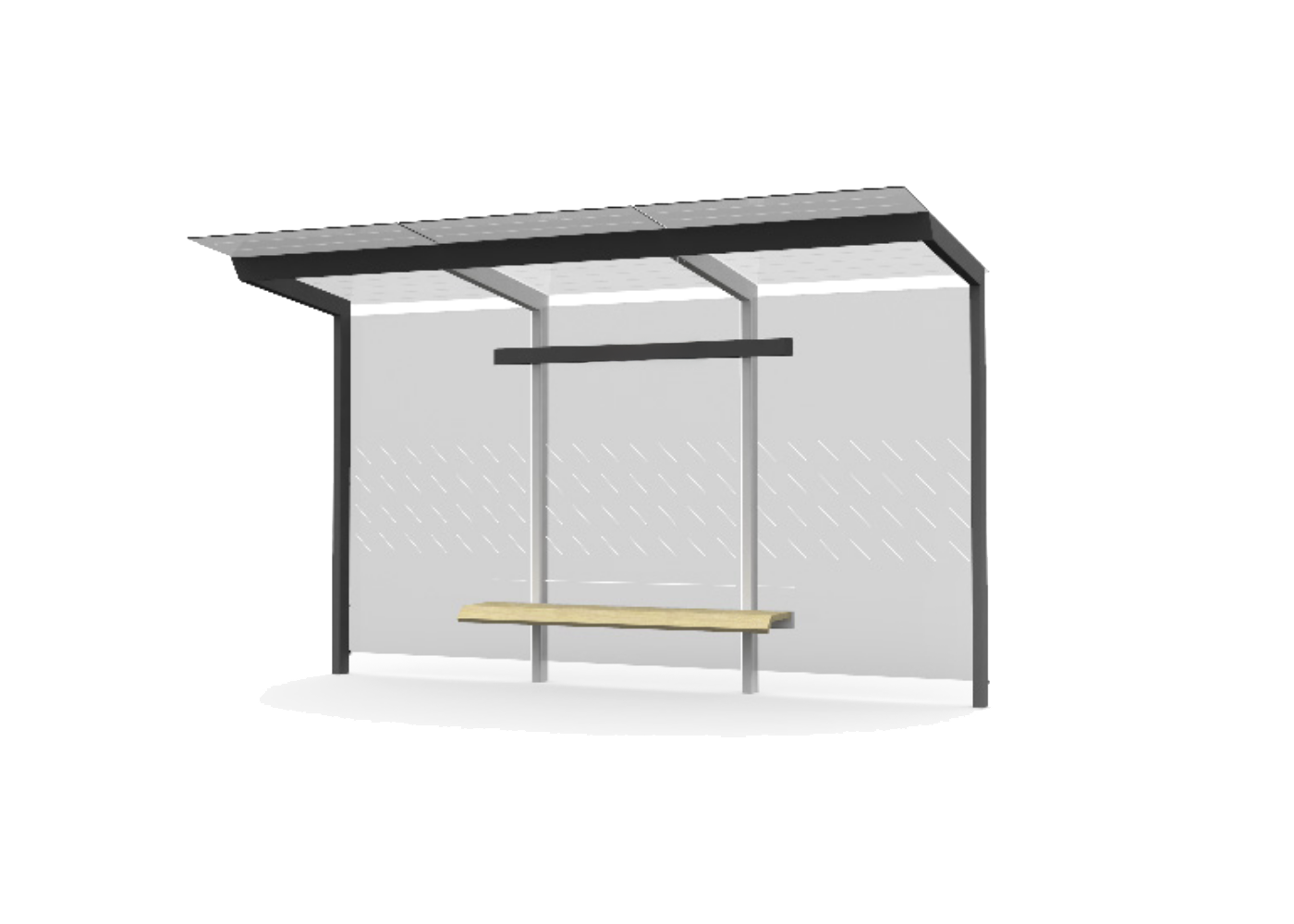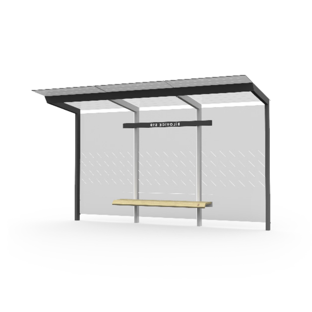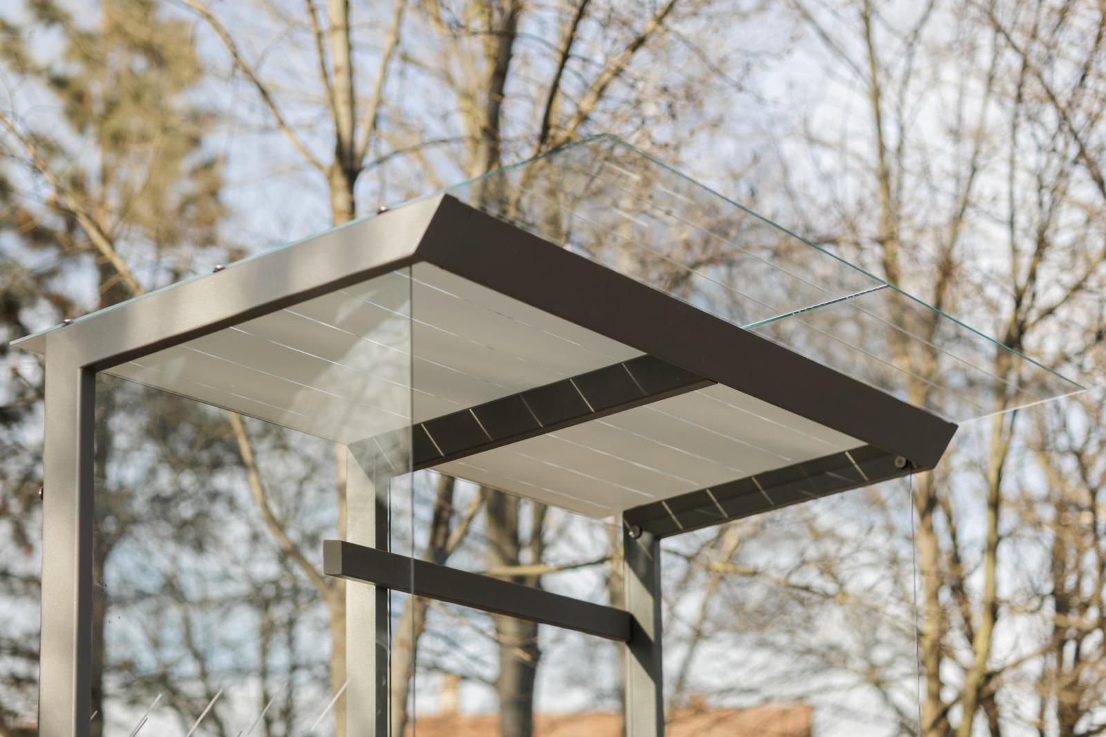 Marquesina de diseño, con estructura fabricada en acero (tratado con el proceso Ferrus el protector de triple capa para el hierro, que garantiza una óptima resistencia a la corrosión). Banqueta en madera tropical tratada con aceite protector. Cristal laminado.