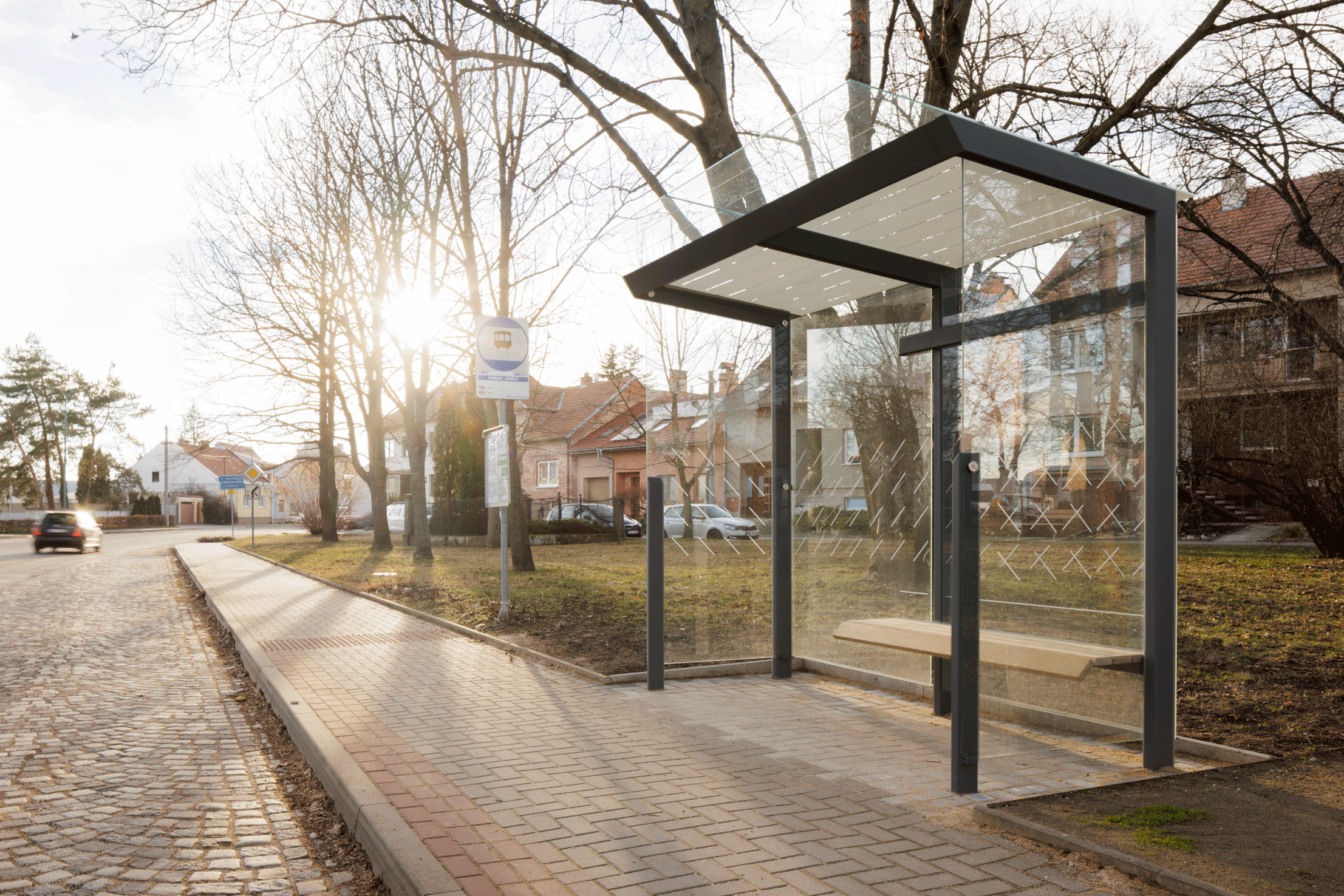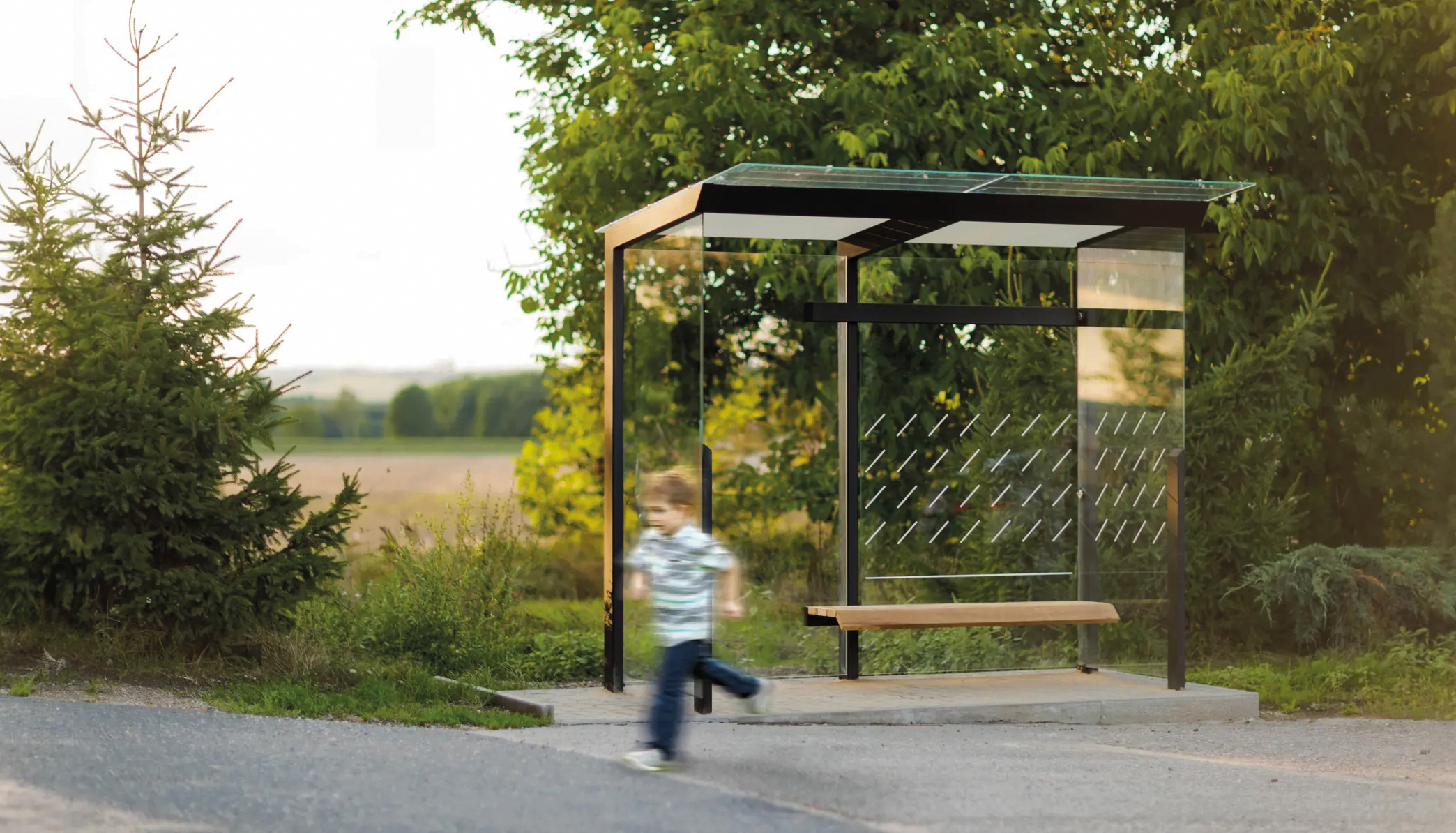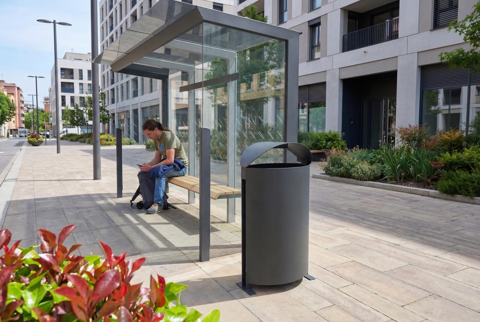Marquesina de diseño, con estructura fabricada en acero (tratado con el proceso Ferrus el protector de triple capa para el hierro, que garantiza una óptima resistencia a la corrosión). Banqueta en madera tropical tratada con aceite protector. Cristal laminado.