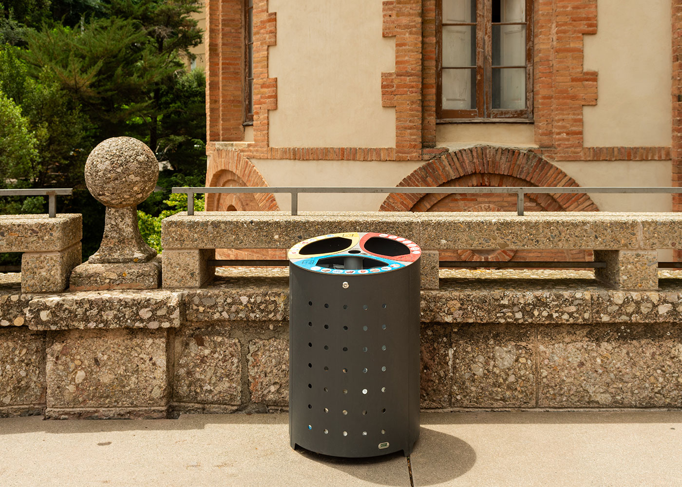 Papelera de diseño DORIA, medidas totales (Ø x alto 1 x alto 2) 620x910x820 mm, 3x75 litros, fabricada en chapa de acero galvanizada (tratado con el proceso Ferrus el protector de triple capa para el hierro, que garantiza una óptima resistencia a la corrosión), con cenicero central (con apaga cigarrillos y cubeta propia) y tres entradas de residuos distintas (con sistema para la sujeción de la bolsa), cada una marcada con el color y pictograma universal, identificativos del residuo. Cierre mediante llave triangular estándar, con sistema de bloqueo automático, para bolsas de 75 litros. Preparada para anclaje con 3 pernos de expansión Ø10 según superficie y proyecto.