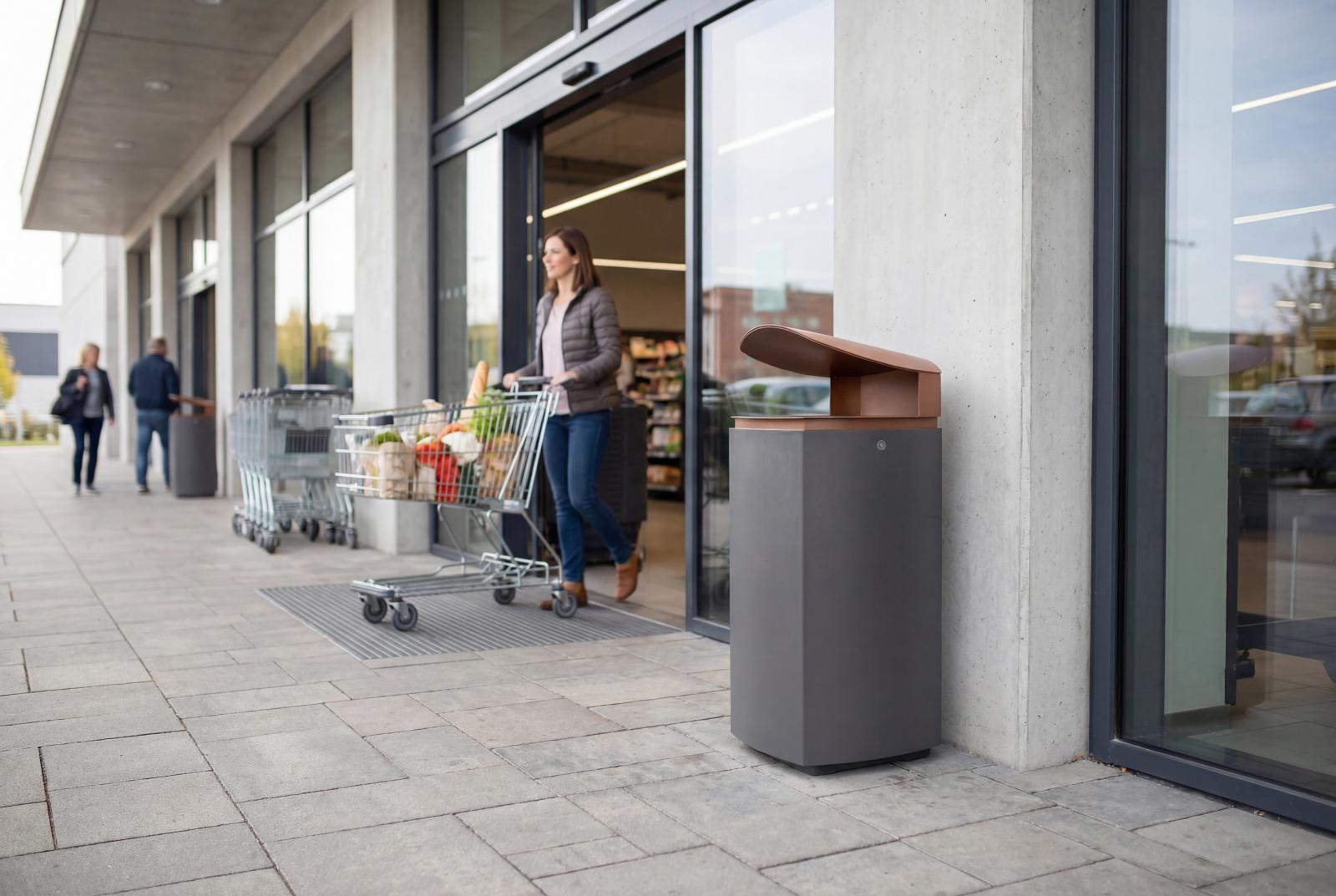 Papelera de diseño MIELEK M, medidas totales (ancho x profundo x alto) 410x410x920 mm, 80 litros, fabricada en acero (tratado con el proceso Ferrus el protector de triple capa para el hierro, que garantiza una óptima resistencia a la corrosión), cubeta interior galvanizada, cierre de seguridad autoblocante, tapa color marson. Preparada para anclaje con 4 pernos de expansión Ø10 según superficie y proyecto.
