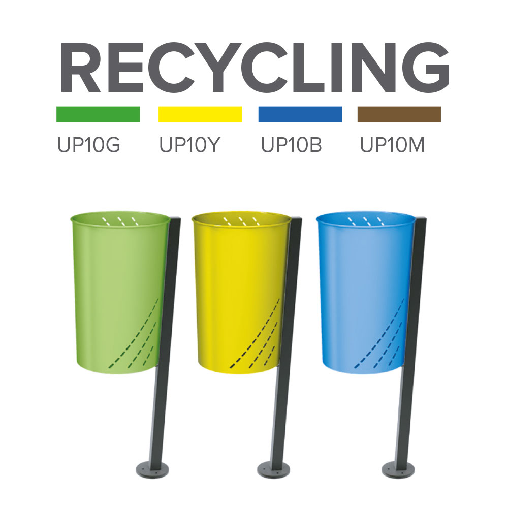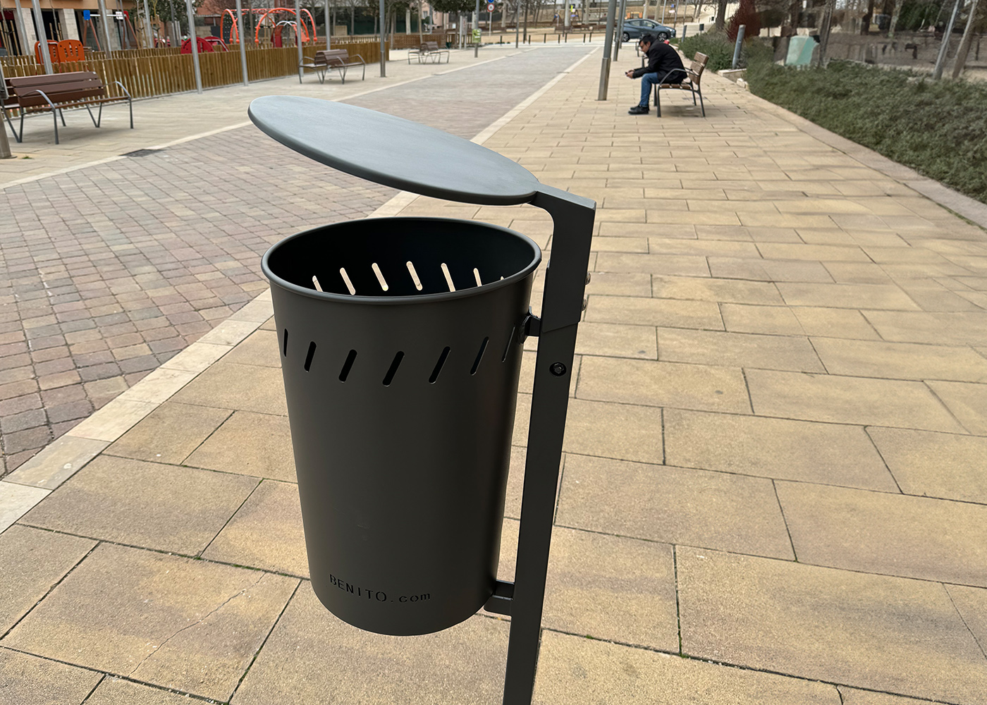 Papelera fabricada con cubeta abatible de acero, con franjas reservando un espacio central para mayor robustez o posibles marcajes. Acabado con tratamiento Ferrus, proceso protector del hierro que garantiza una óptima resistencia a la corrosión.