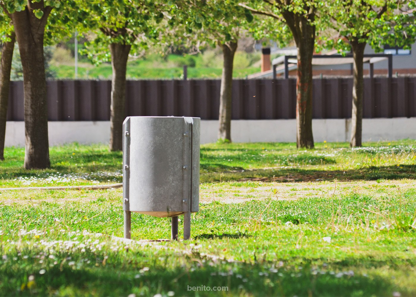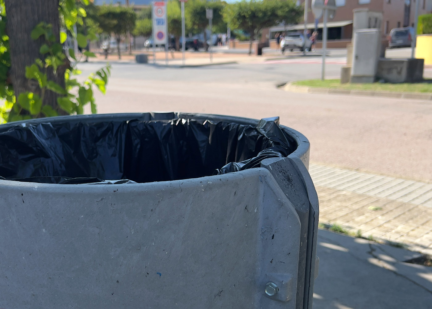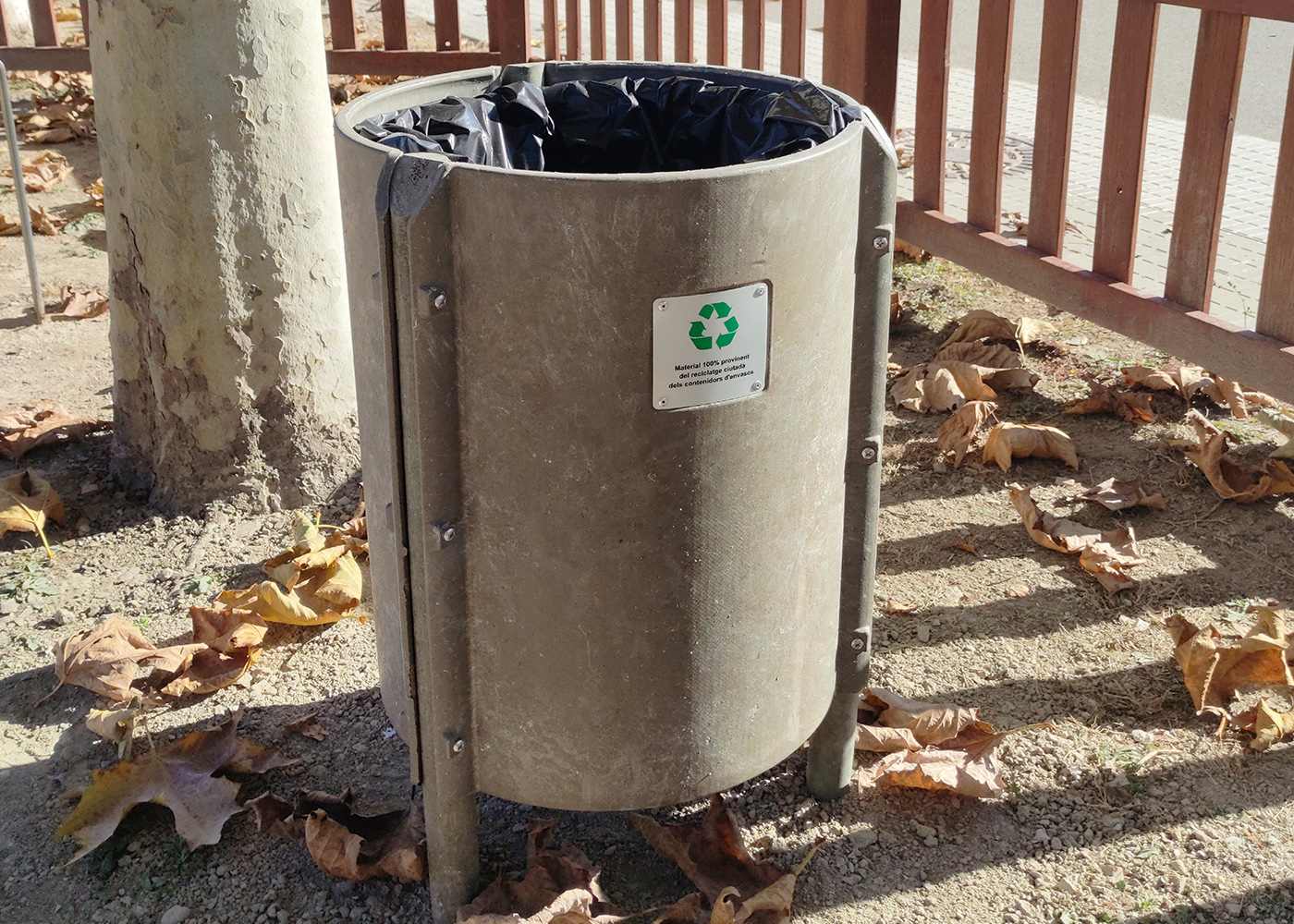 Papelera de diseño RELEU con aro, diseño antivandalico, medidas totales (Ø x alto) 450x800 mm, 90 litros, fabricado en plástico reciclado obtenido de la recogida selectiva urbana, 100% reciclado y reciclable, material durable, inalterable a la intemperie, resistente al agua y que NO requiere ningún tipo de mantenimiento. Preparada para anclaje con tornillos según superficie y proyecto.