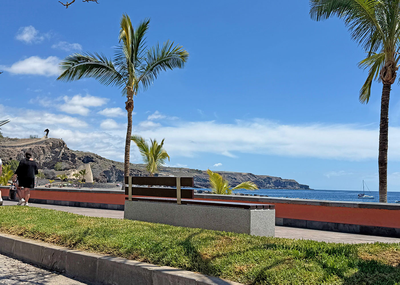 Banco de diseño ELA PLUS 3000, medidas totales (largo x alto x profundo) 3000x870x800 mm, fabricado con asiento de hormigón armado hidrófugo moldeado, color blanco granítico pulido, estructura de acero inoxidable mate y listones de madera tropical natural (tratados con recubrimiento de triple capa Lignus, protector fungicida, insecticida e hidrófugo). Apoyado sobre superficie preparada, por su propio peso.