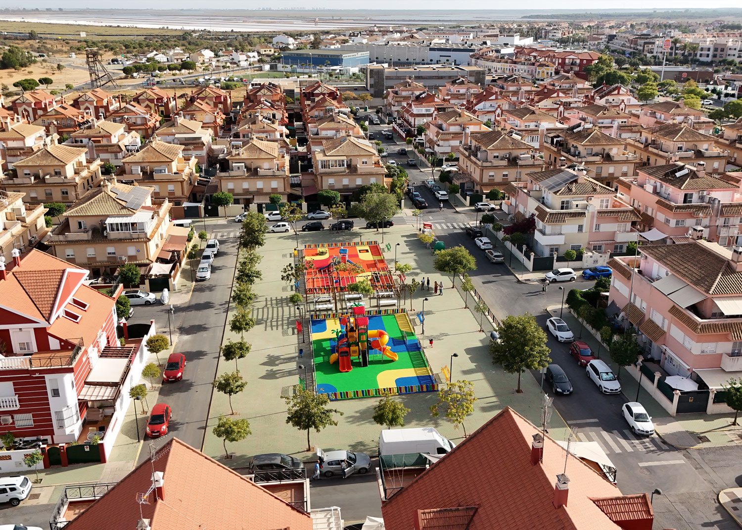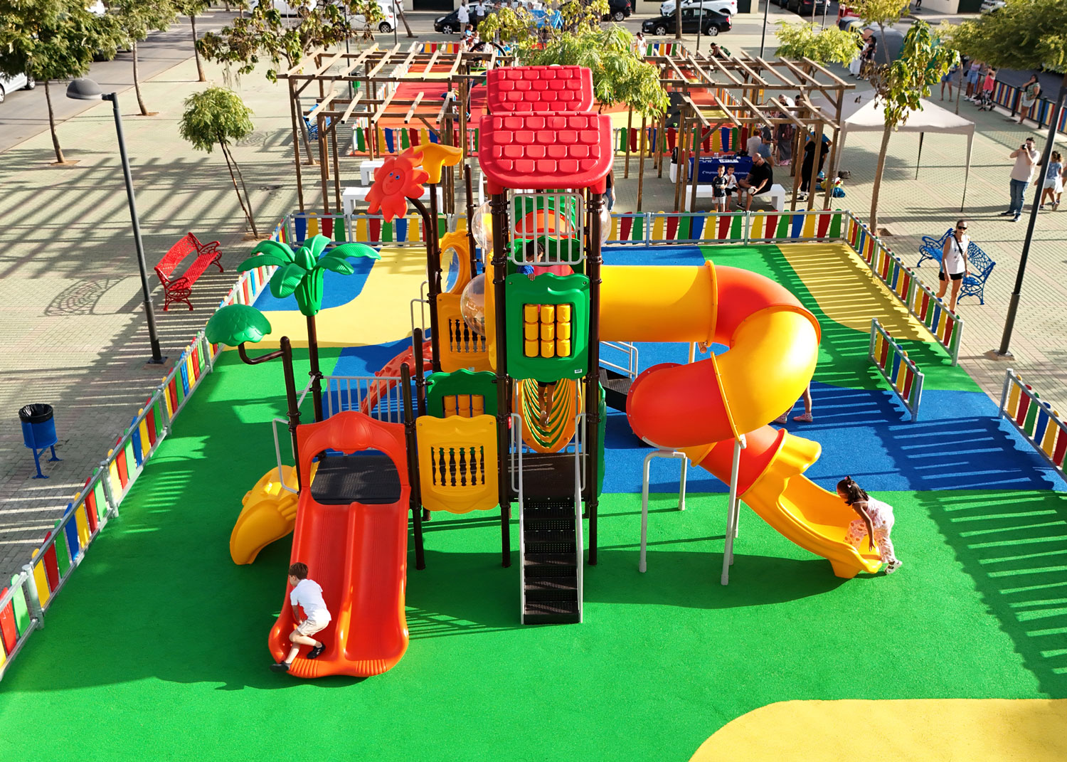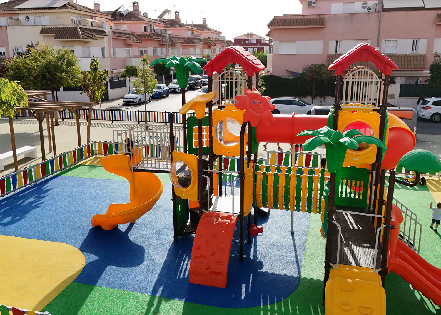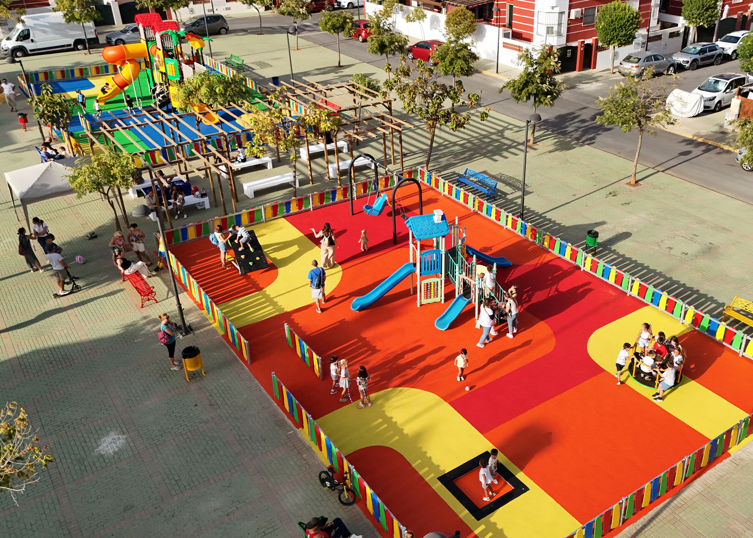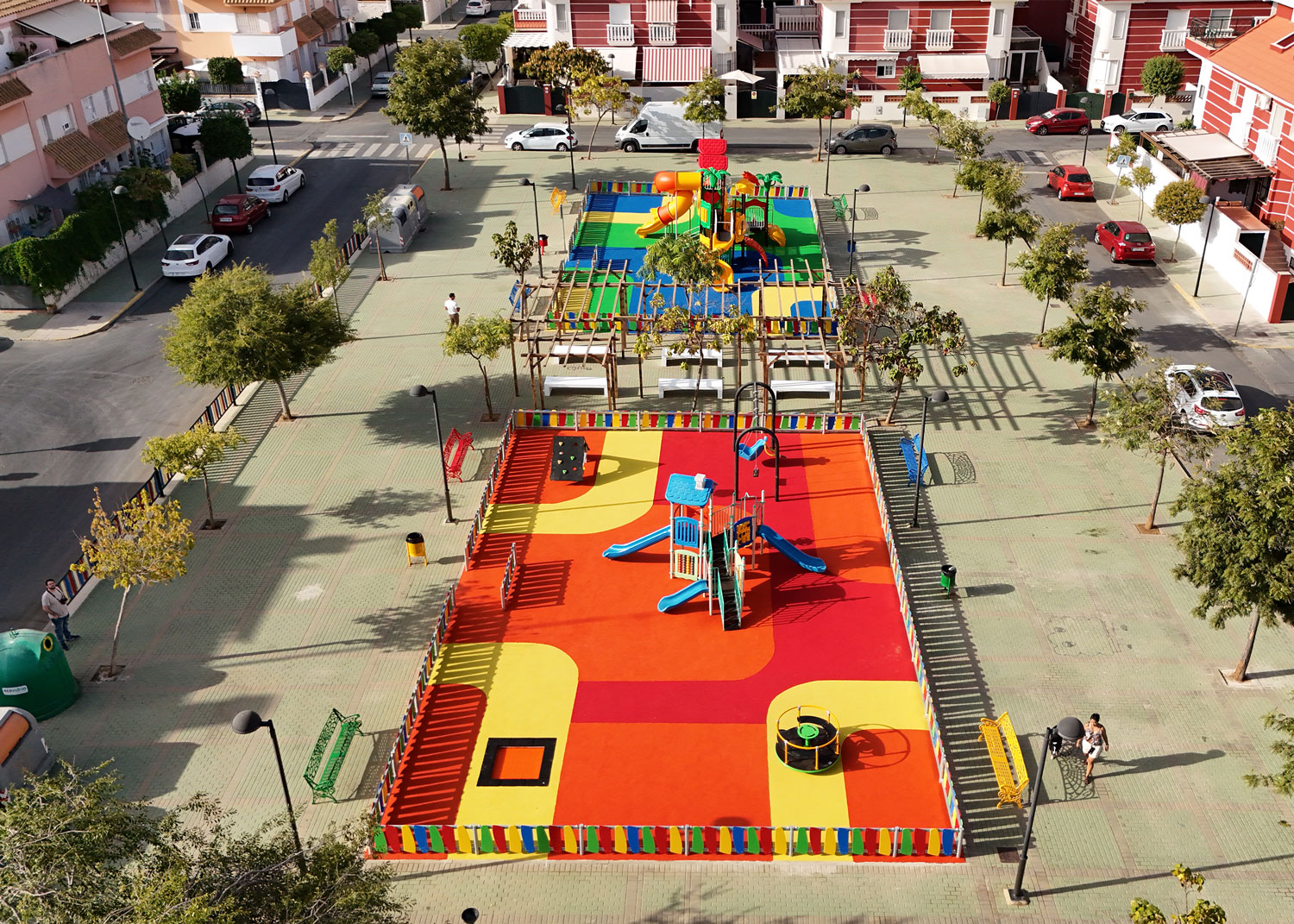 El uso de pavimento amortiguante multicolor y vallados decorativos convierte este espacio en un entorno alegre y seguro, perfectamente integrado en el tejido urbano de Aljaraque.
