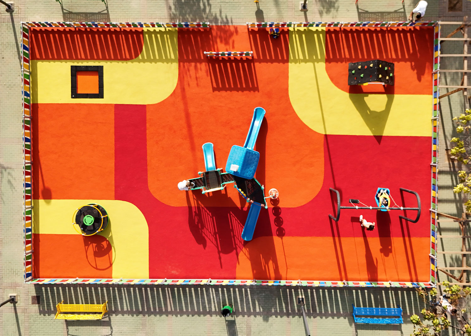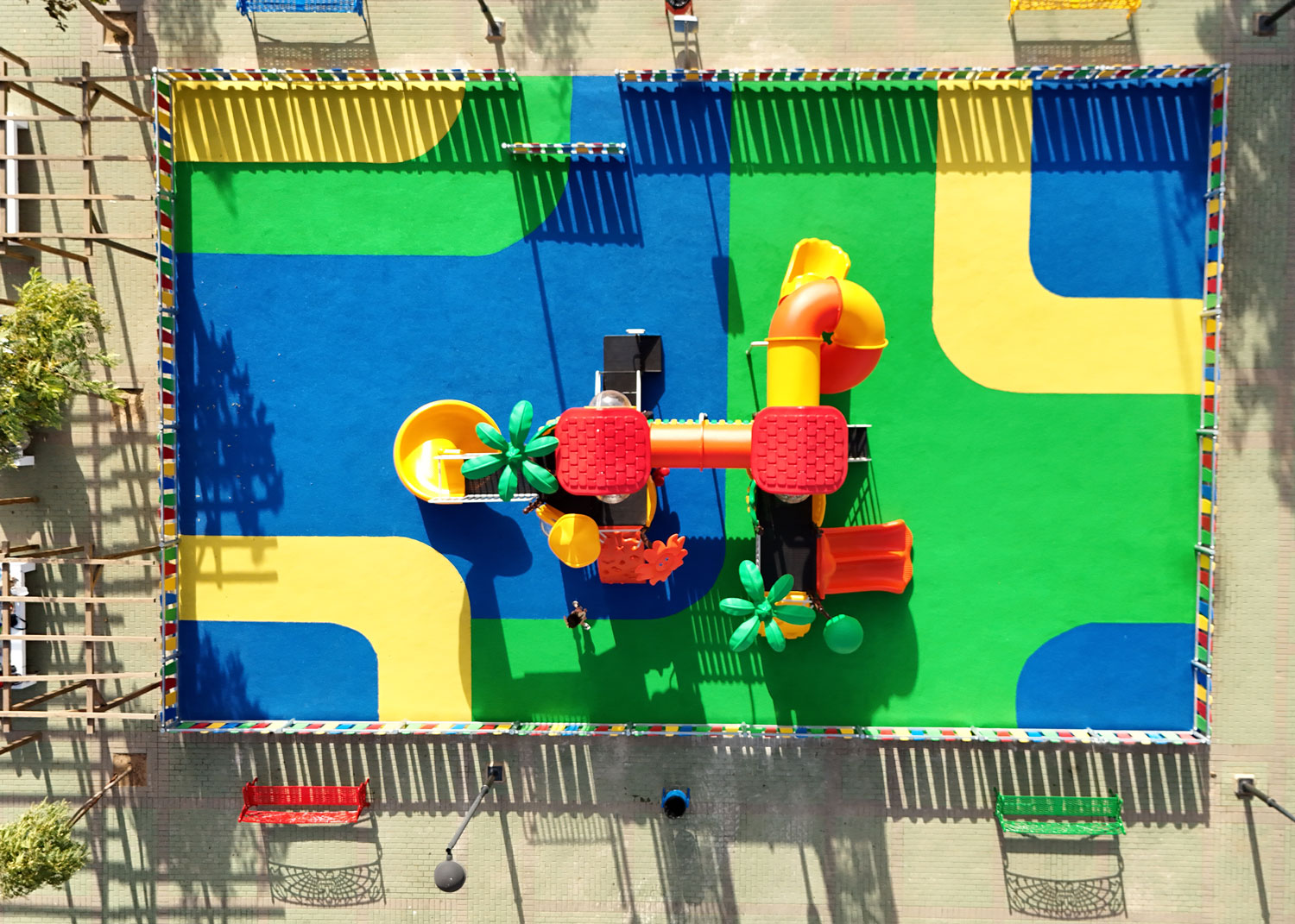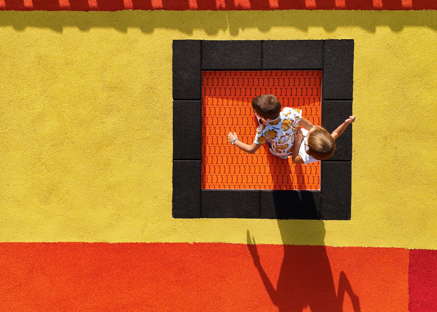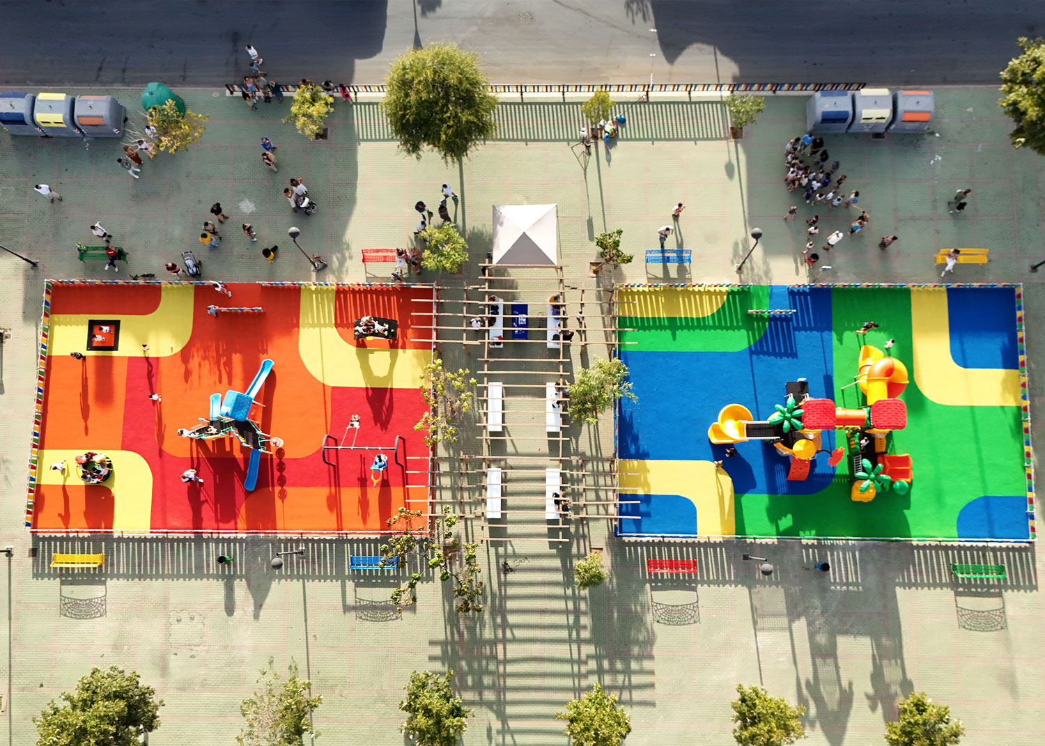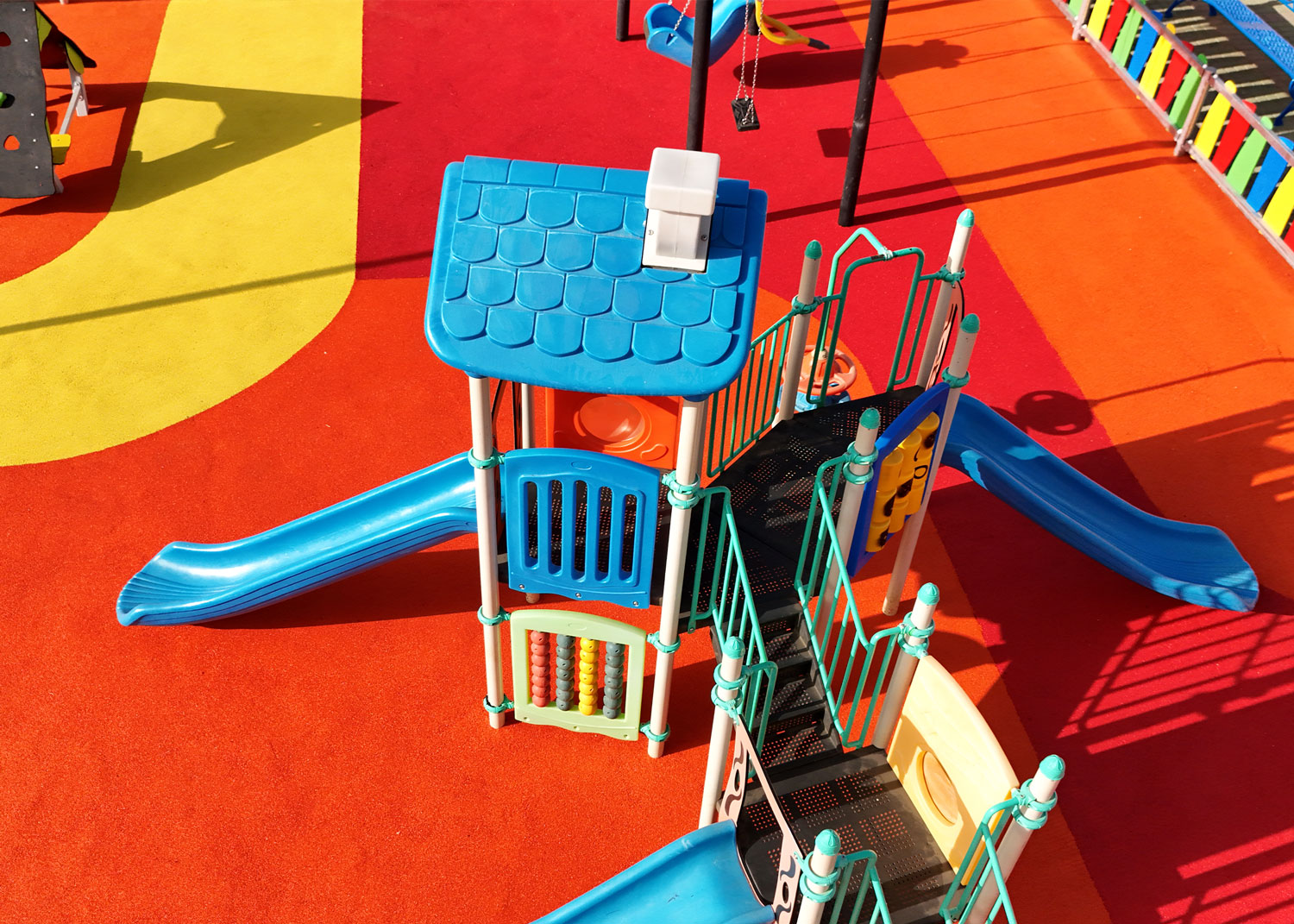 El uso de pavimento amortiguante multicolor y vallados decorativos convierte este espacio en un entorno alegre y seguro, perfectamente integrado en el tejido urbano de Aljaraque.