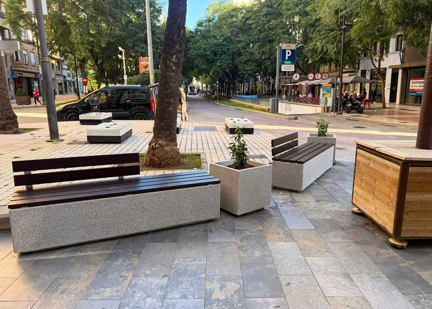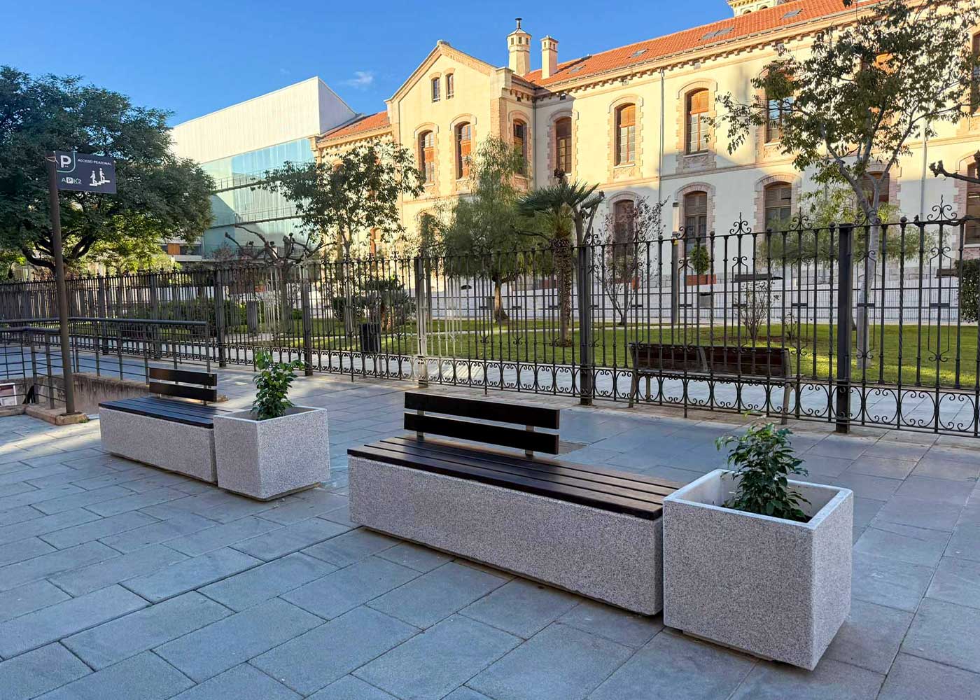 La intervención se completa con jardineras KUBE, integradas junto a los bancos para realzar la presencia del material y aportar valor paisajístico mediante la incorporación de vegetación. Esta combinación de mobiliario y elementos verdes contribuye a crear espacios más agradables, sostenibles y visualmente atractivos, reforzando la identidad urbana del centro de Castellón de la Plana.